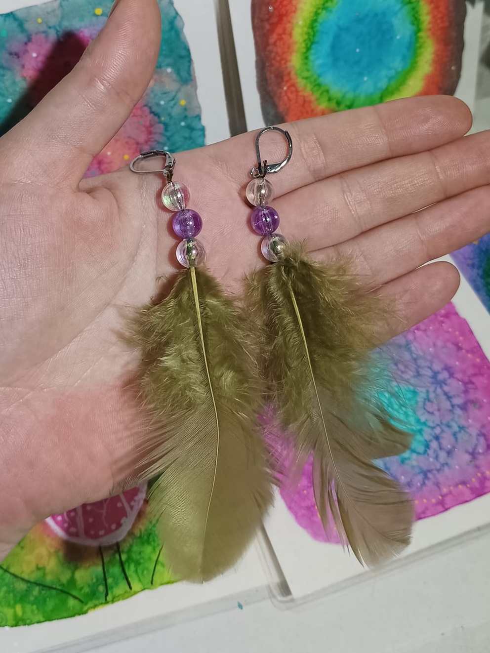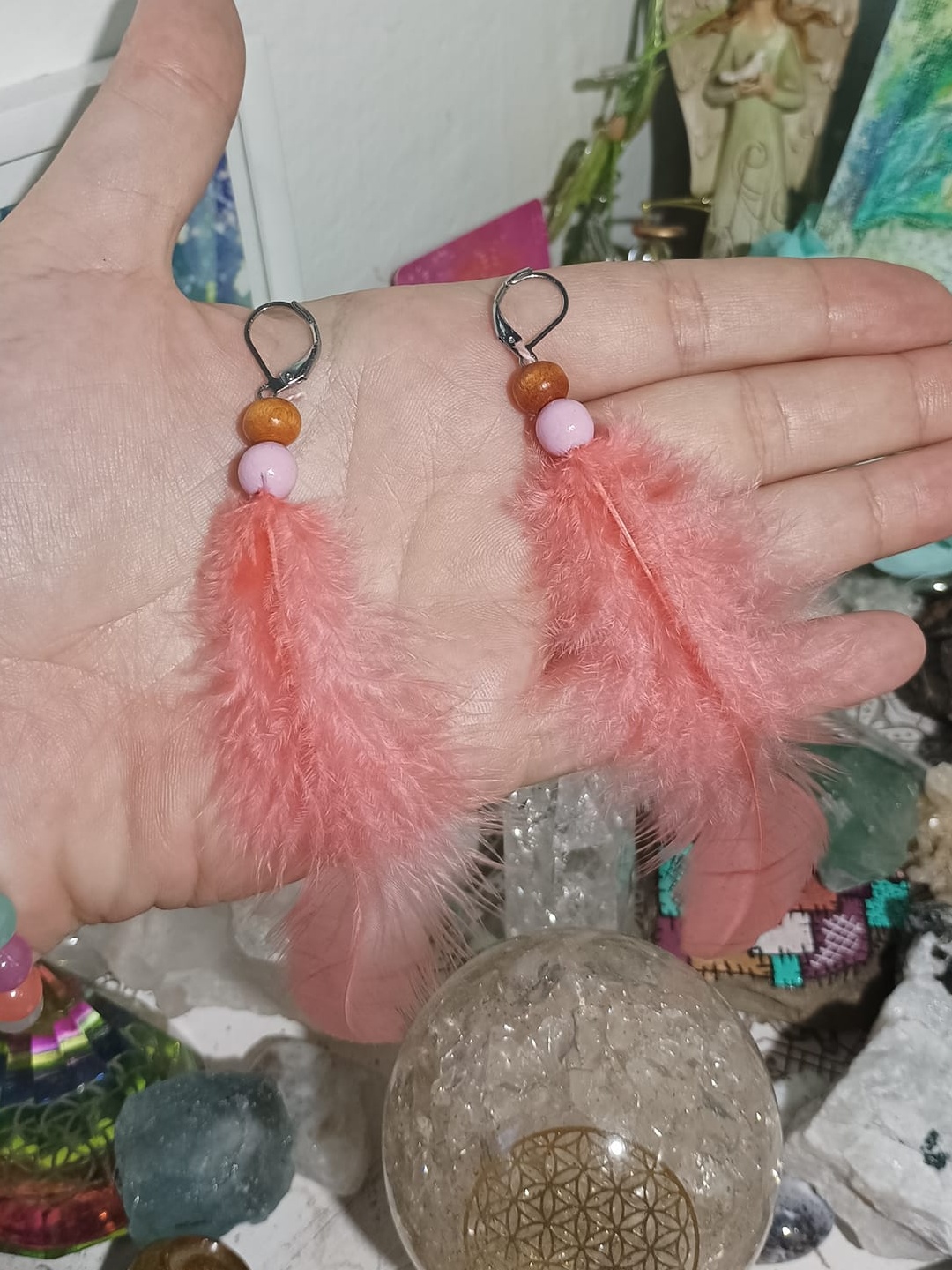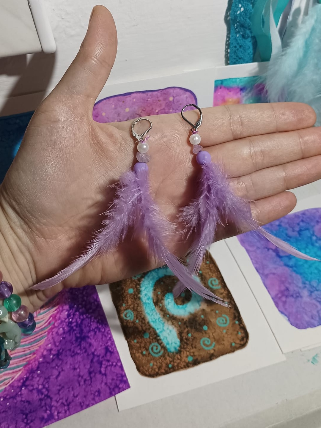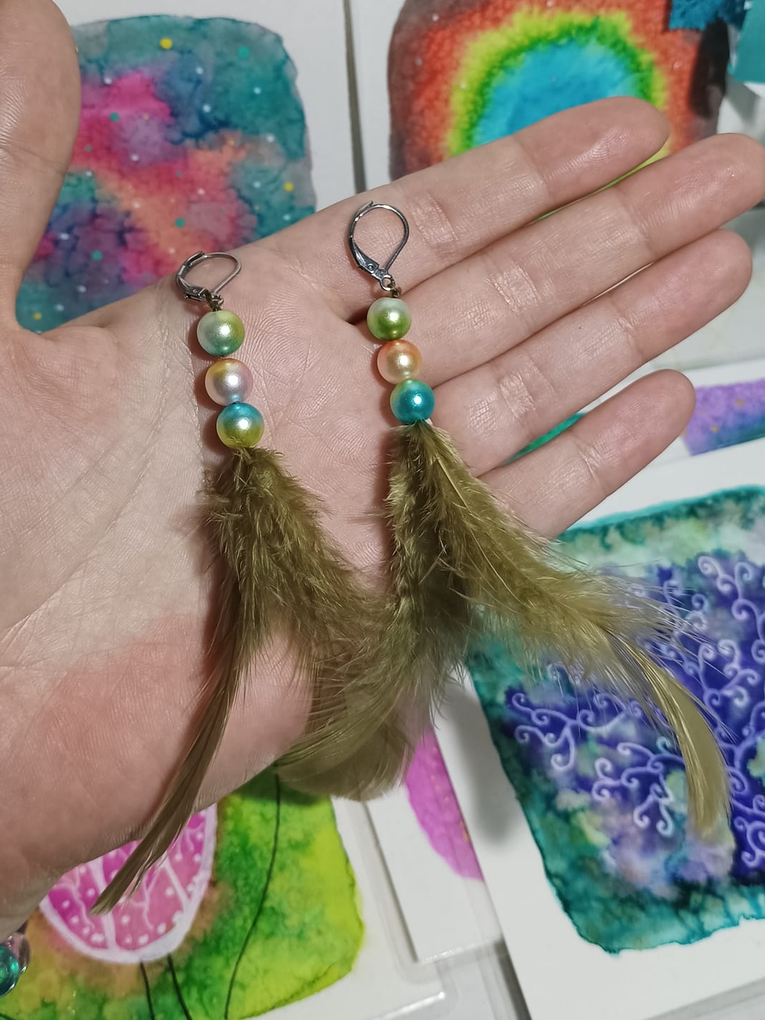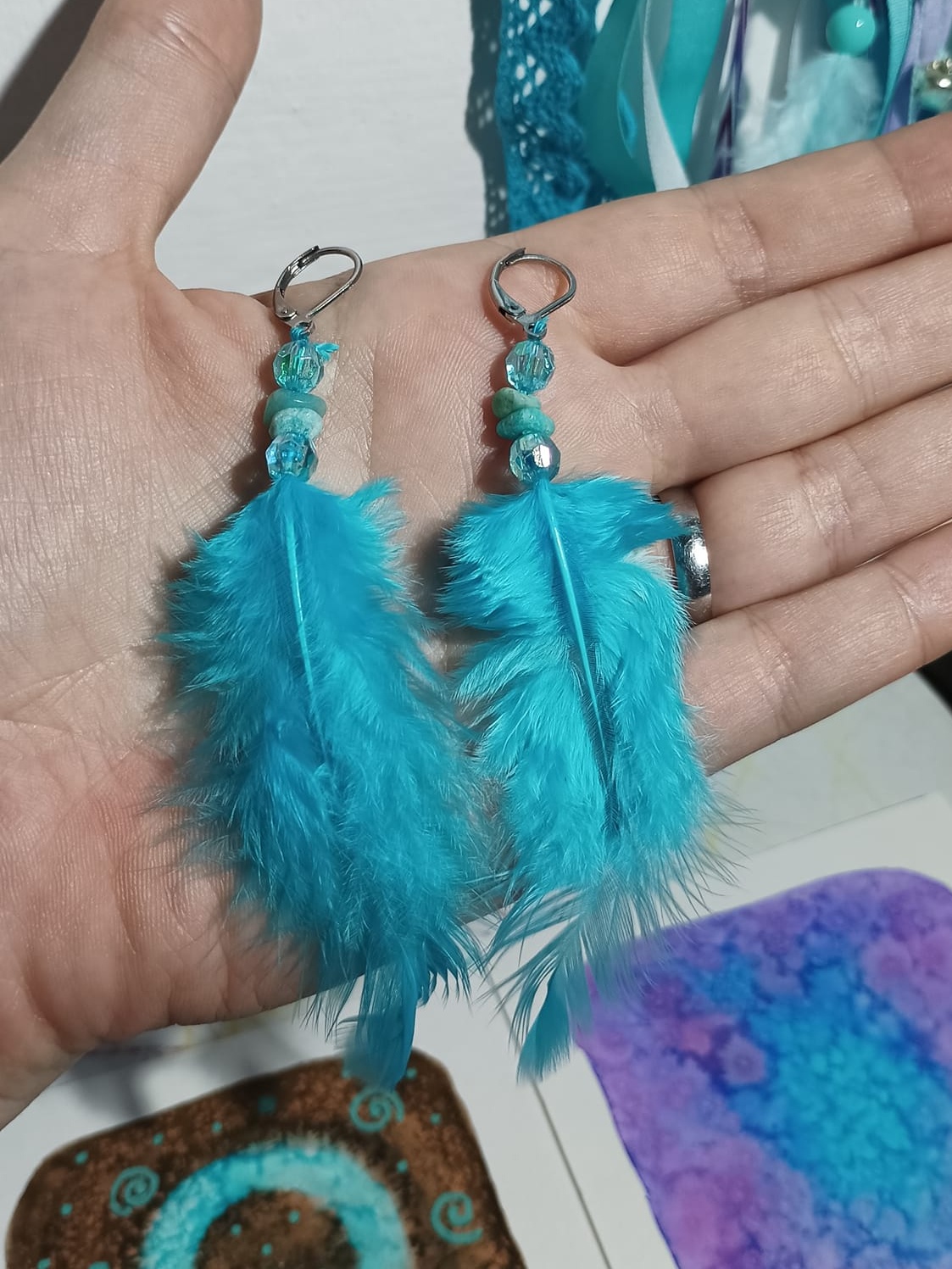 Vlastnoručně vyráběné peříčkové náušnice s korálky a minerály. Vyrobím i na přání, stačí napsat na e-mail nebo facebook.