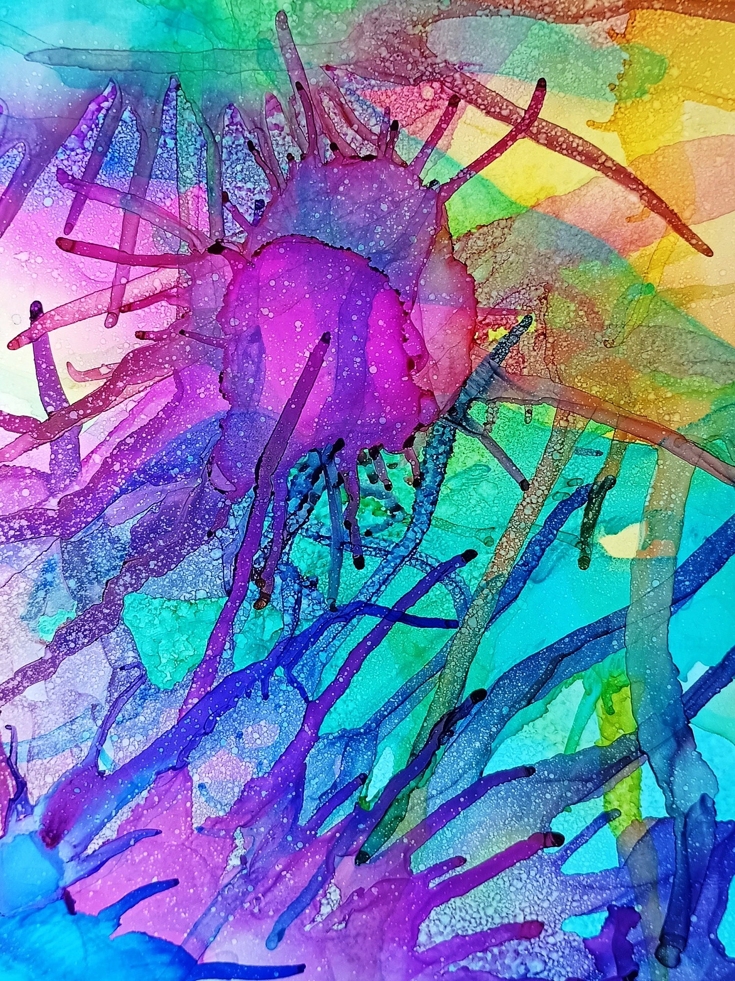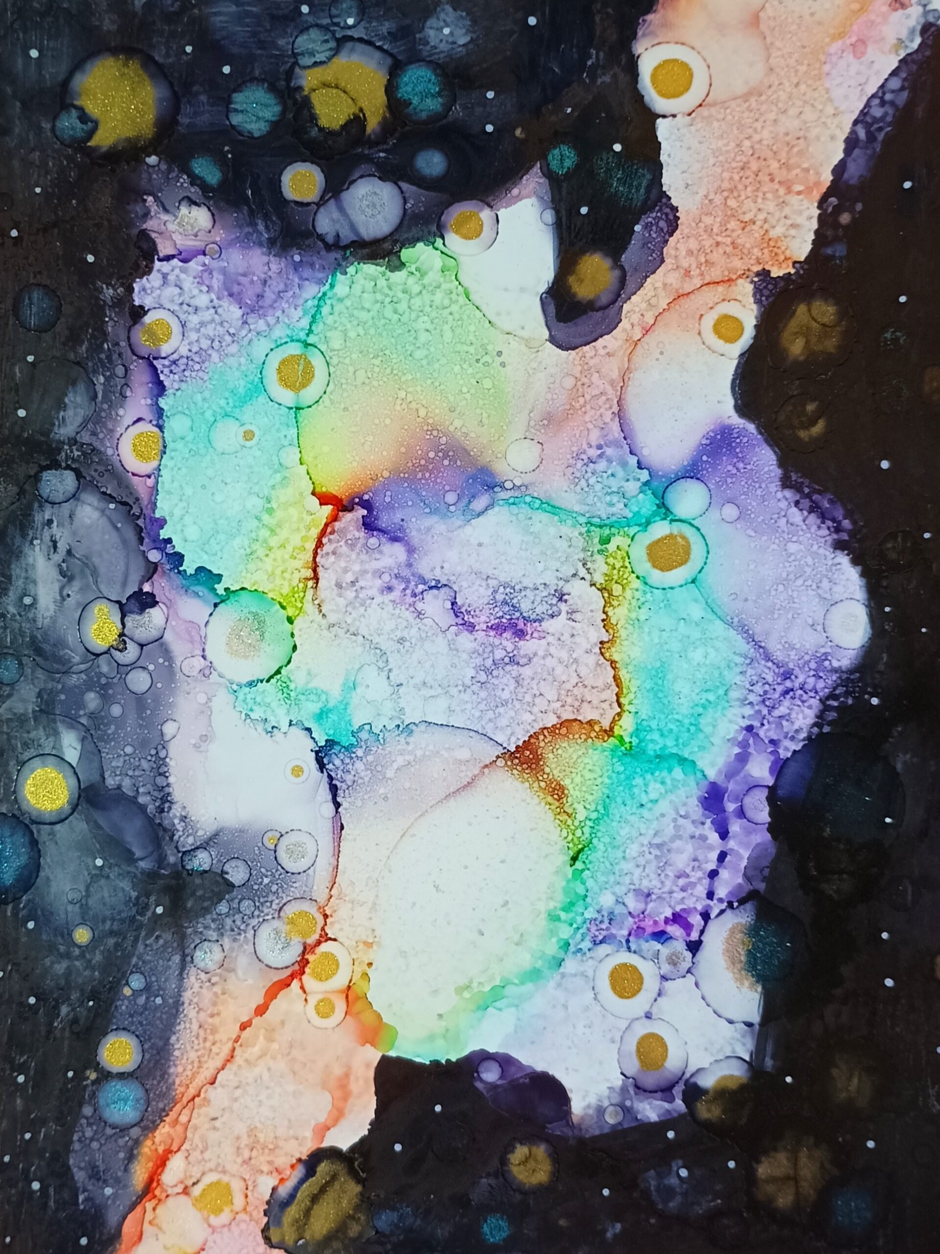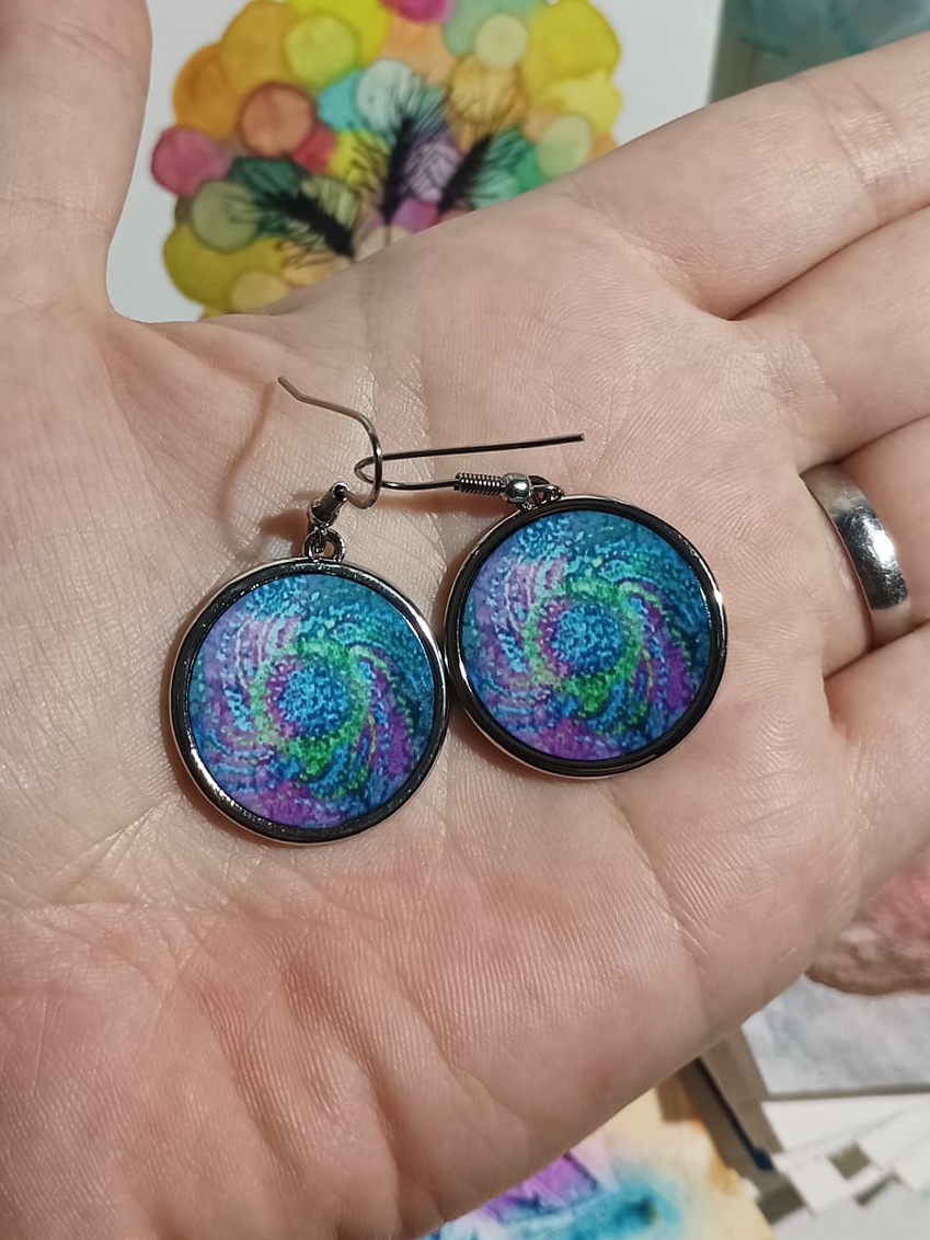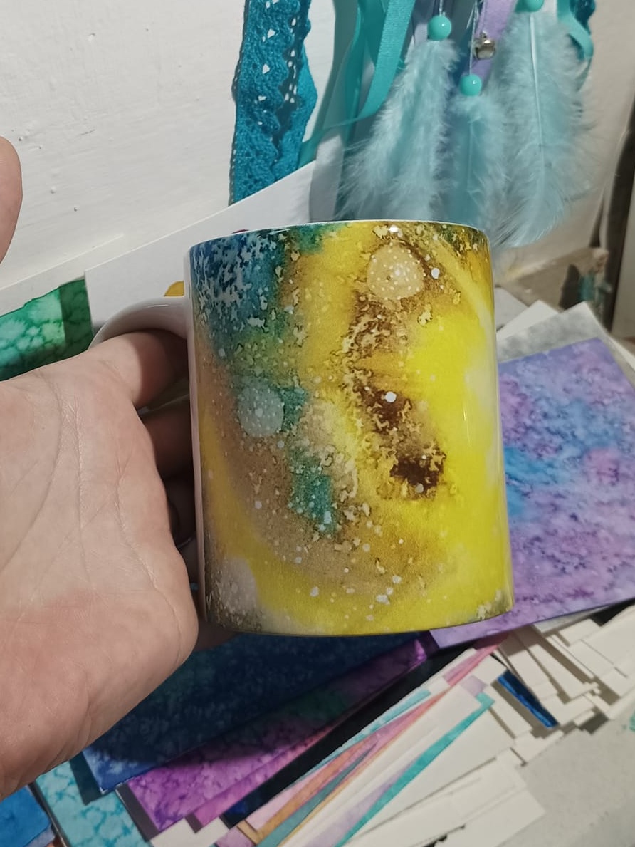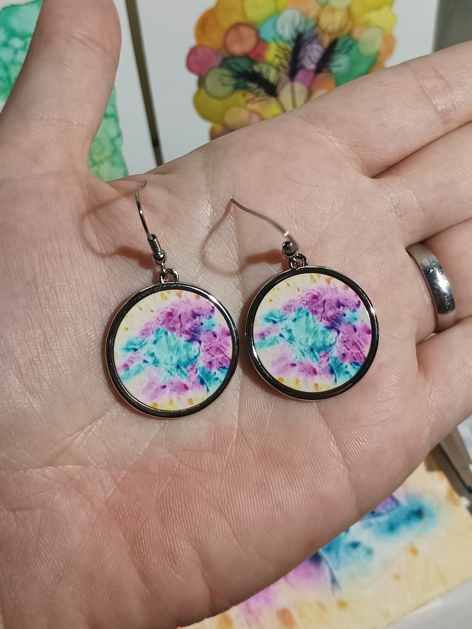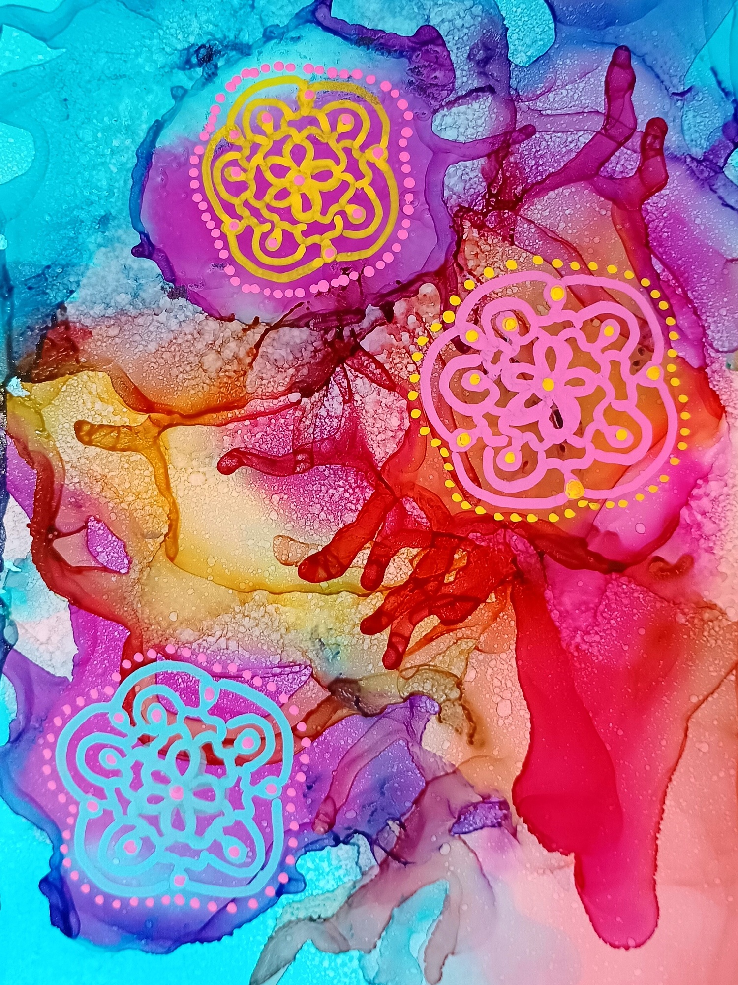 Obrázky tvořené pomocí alkoholových inkoustů, isopropylalkoholu a fénu, popřípadě brčka. Některé jsou dokreslené akrylovými fixy. Intuitivní tvorba, druh automatické kresby… Jsou ve formátu A5 na syntetickém papíru. Tyto malby dále fotím a používám k tisku na šperky, hrníčky, trička, polštáře, nebo z nich nechávám natisknout velkoformátové obrazy na plátno. Pokud o některý obrázek (nebo produkt z něj) máte zájem, stačí se ozvat na e-mail nebo napsat na facebook…