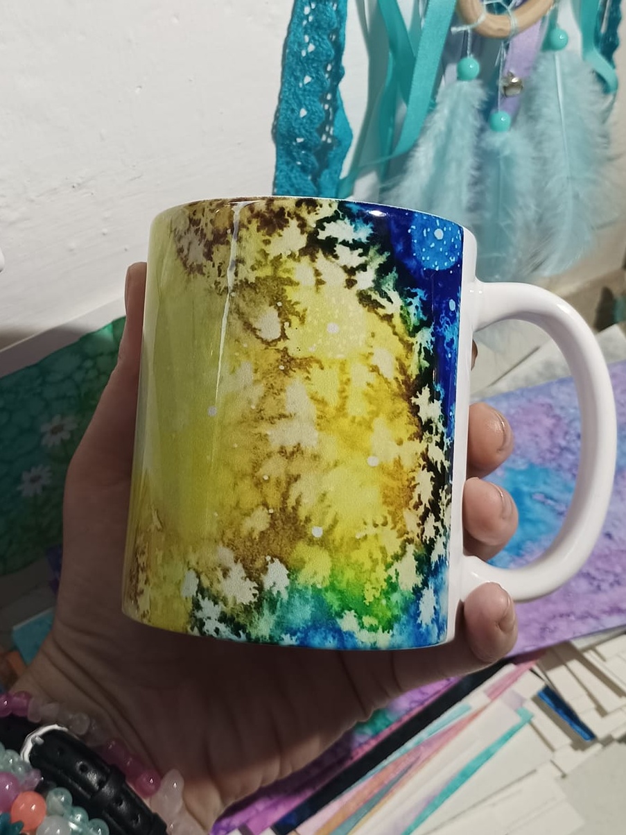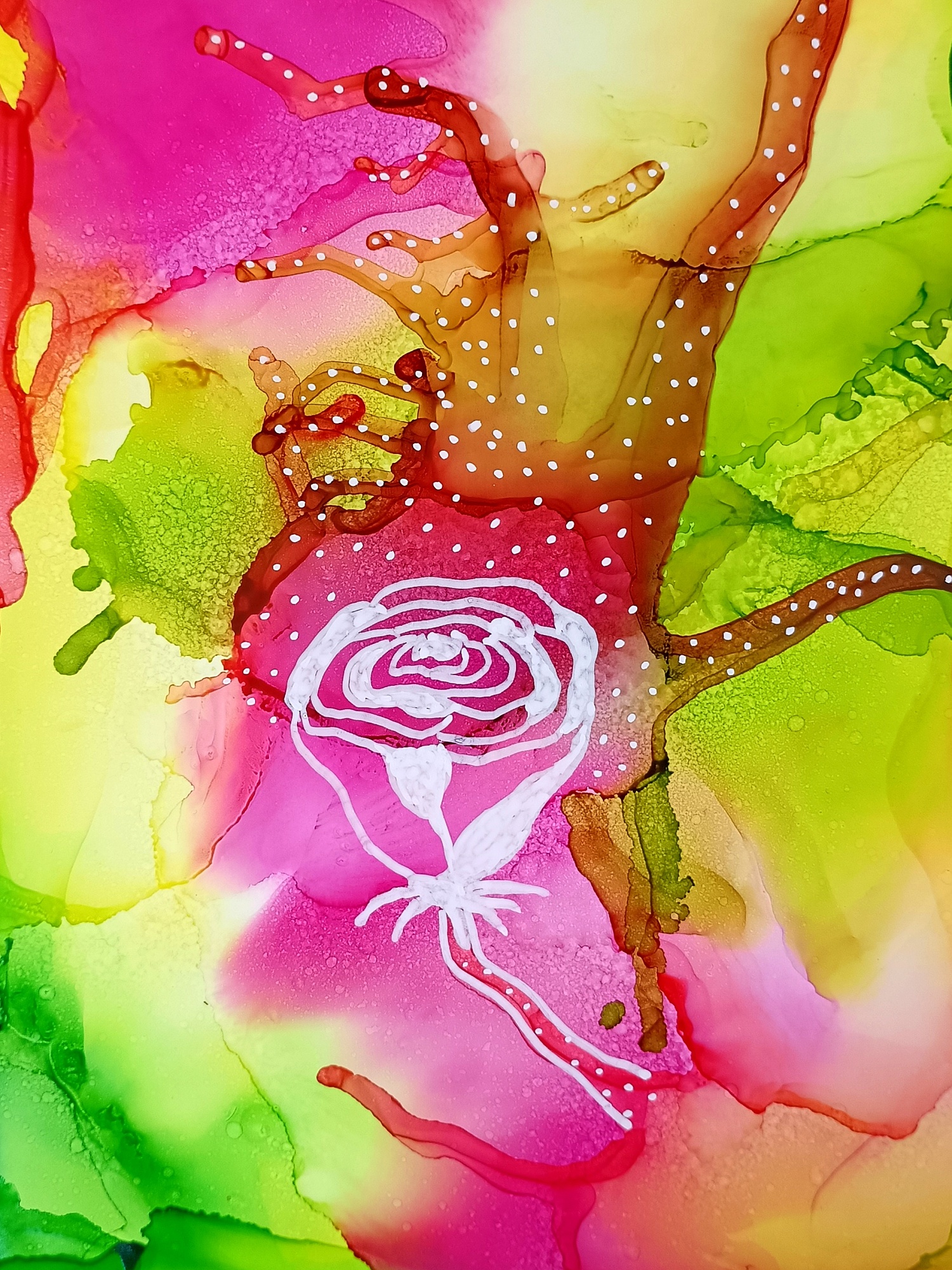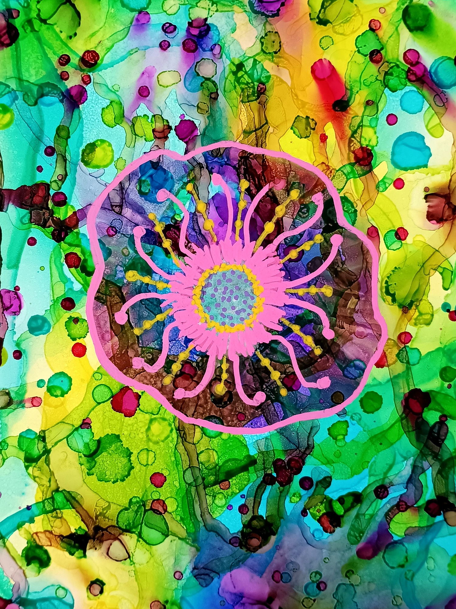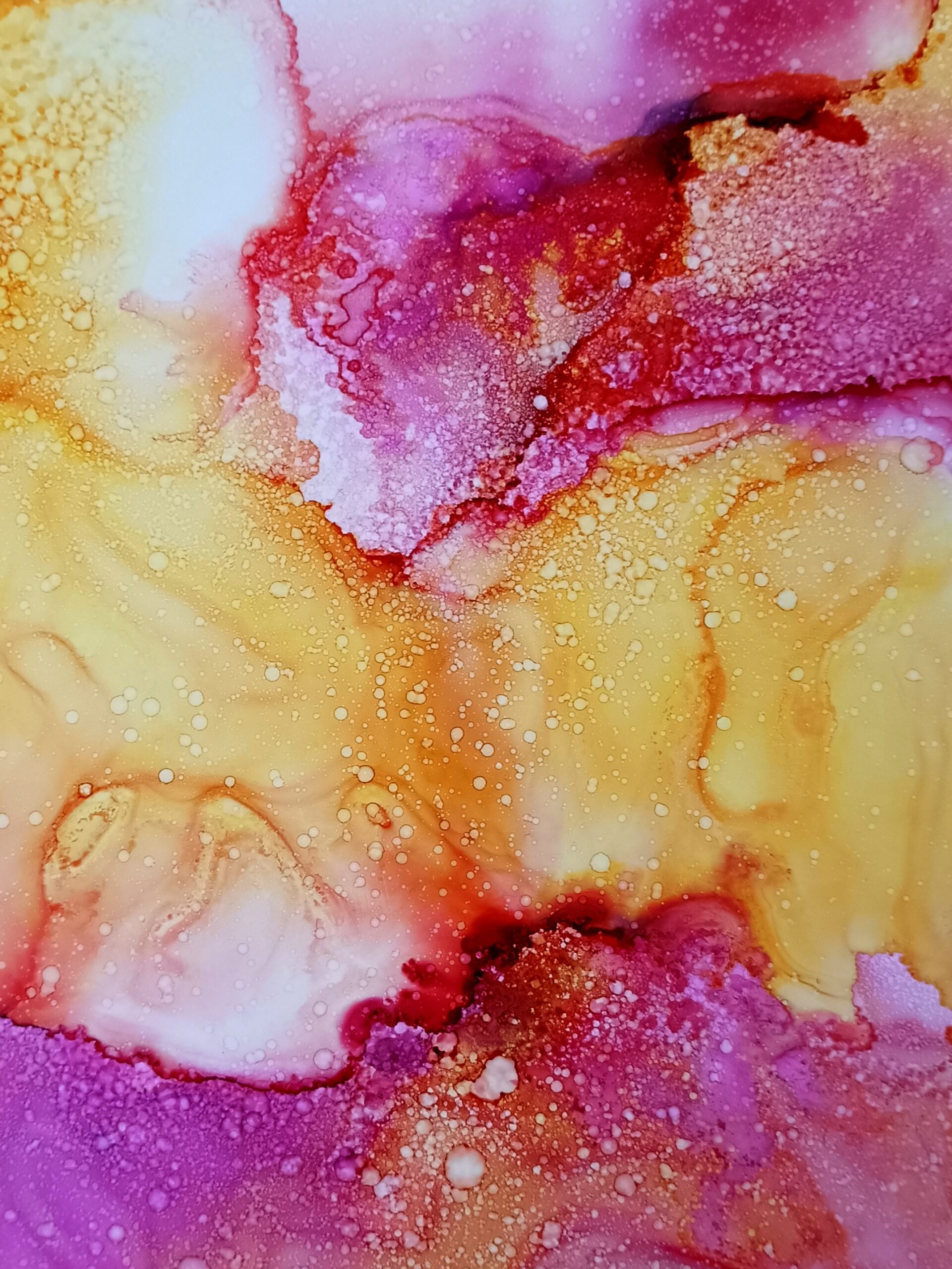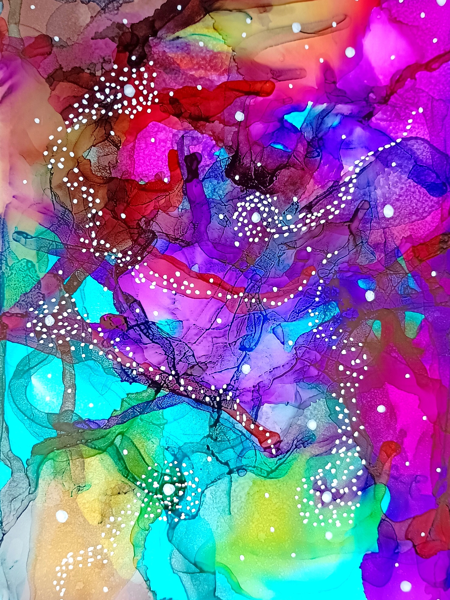 Obrázky tvořené pomocí alkoholových inkoustů, isopropylalkoholu a fénu, popřípadě brčka. Některé jsou dokreslené akrylovými fixy. Intuitivní tvorba, druh automatické kresby… Jsou ve formátu A5 na syntetickém papíru. Tyto malby dále fotím a používám k tisku na šperky, hrníčky, trička, polštáře, nebo z nich nechávám natisknout velkoformátové obrazy na plátno. Pokud o některý obrázek (nebo produkt z něj) máte zájem, stačí se ozvat na e-mail nebo napsat na facebook…