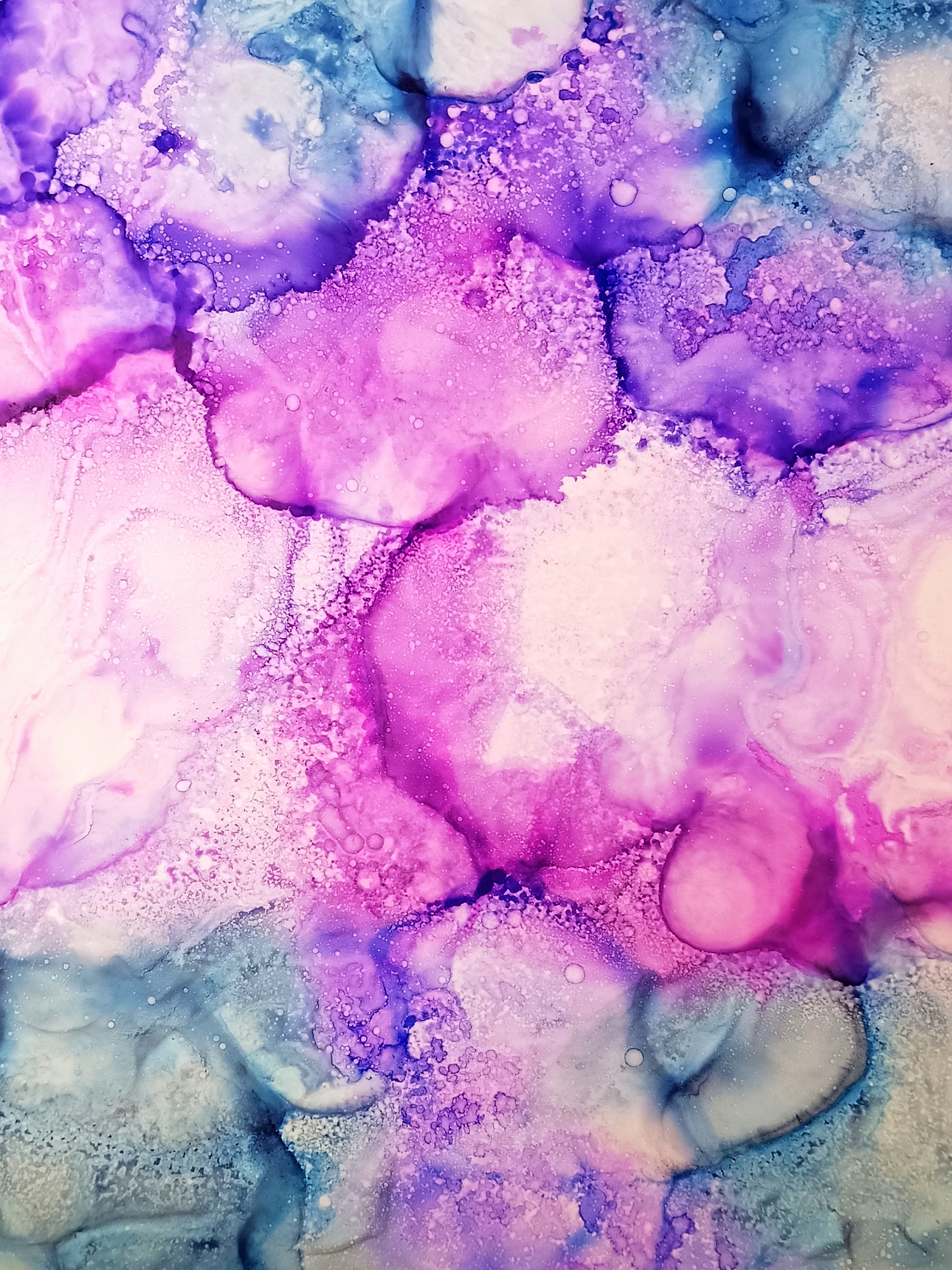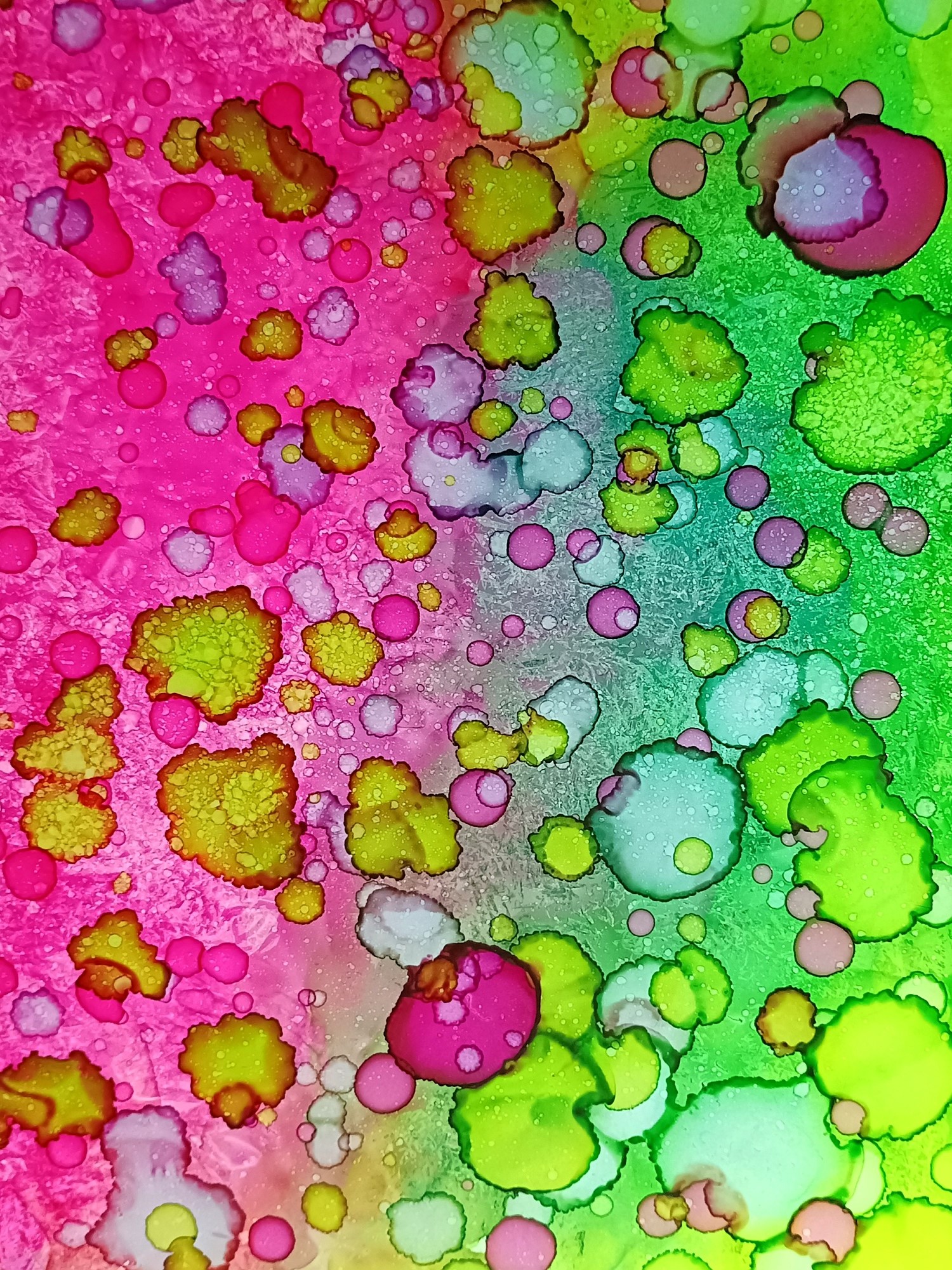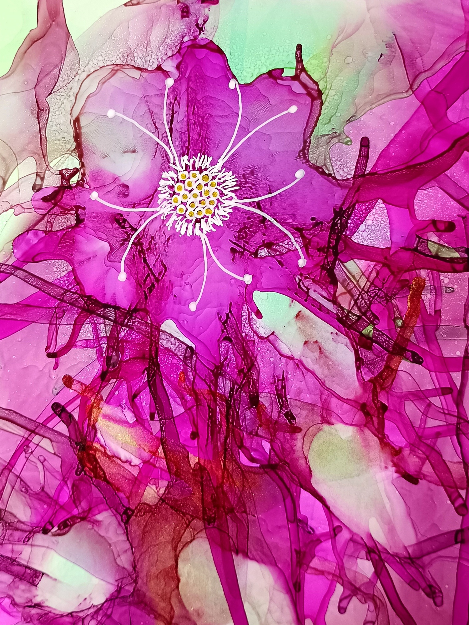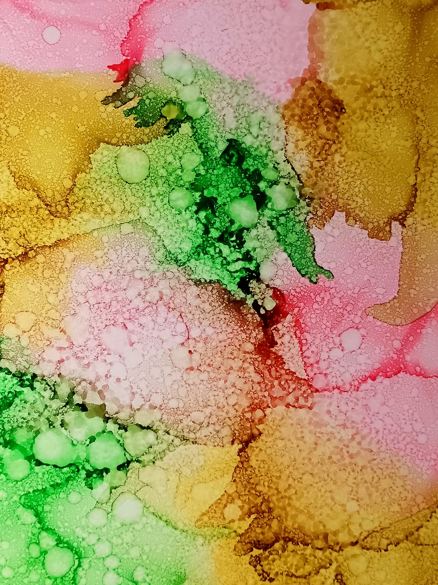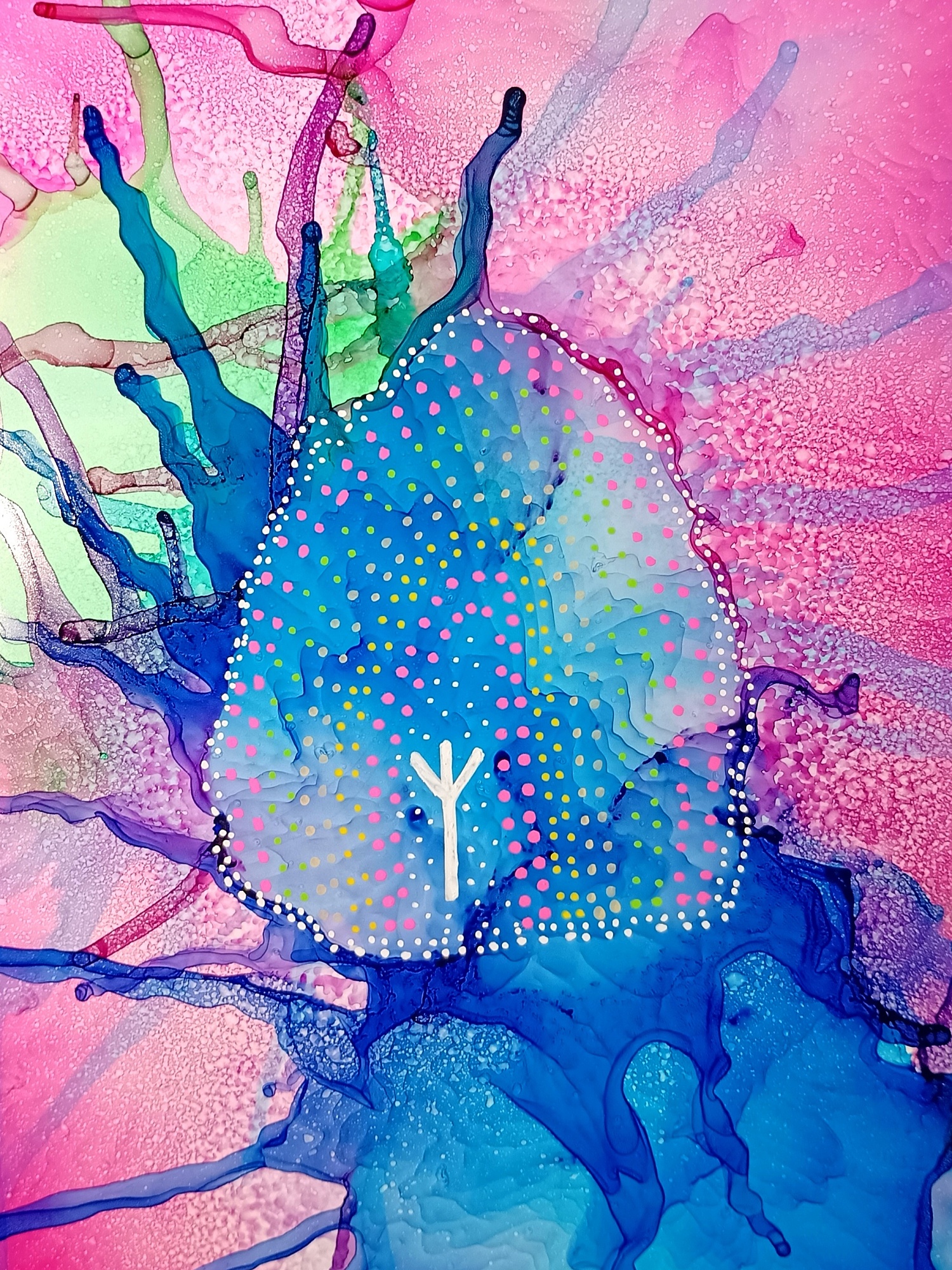 Obrázky tvořené pomocí alkoholových inkoustů, isopropylalkoholu a fénu, popřípadě brčka. Některé jsou dokreslené akrylovými fixy. Intuitivní tvorba, druh automatické kresby… Jsou ve formátu A5 na syntetickém papíru. Tyto malby dále fotím a používám k tisku na šperky, hrníčky, trička, polštáře, nebo z nich nechávám natisknout velkoformátové obrazy na plátno. Pokud o některý obrázek (nebo produkt z něj) máte zájem, stačí se ozvat na e-mail nebo napsat na facebook…