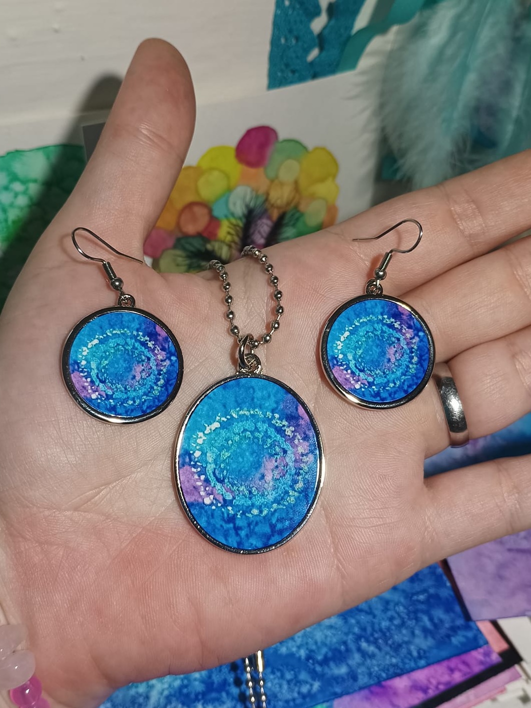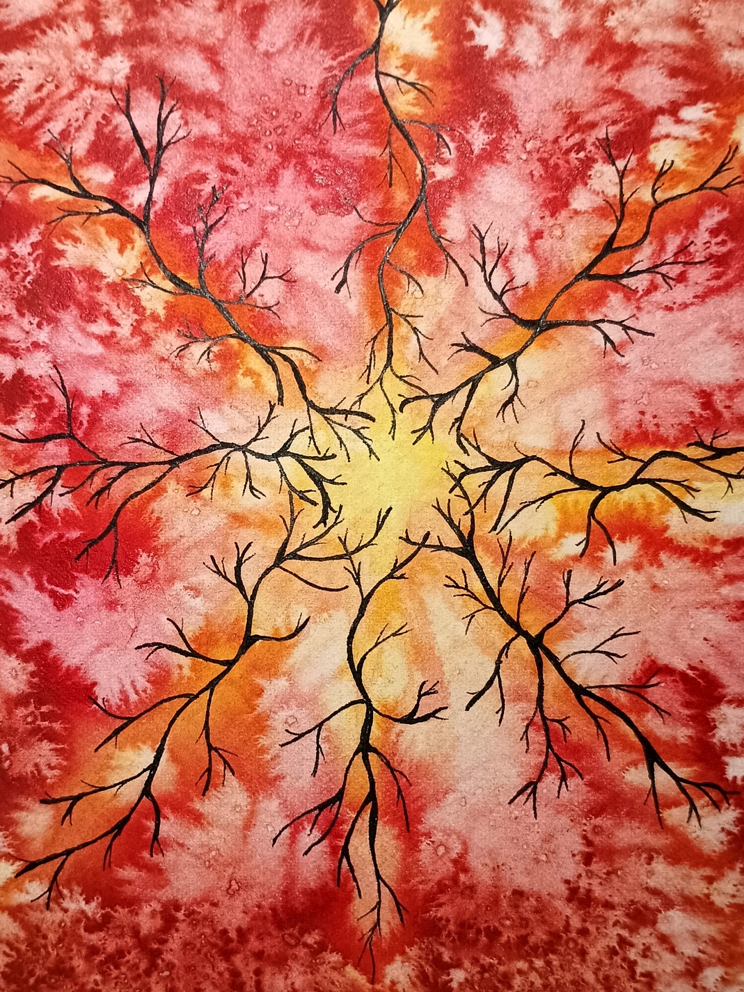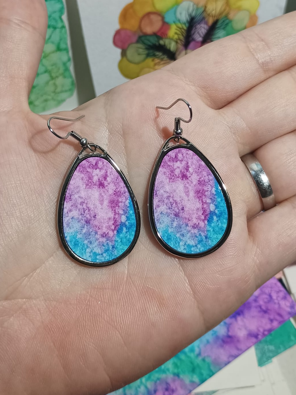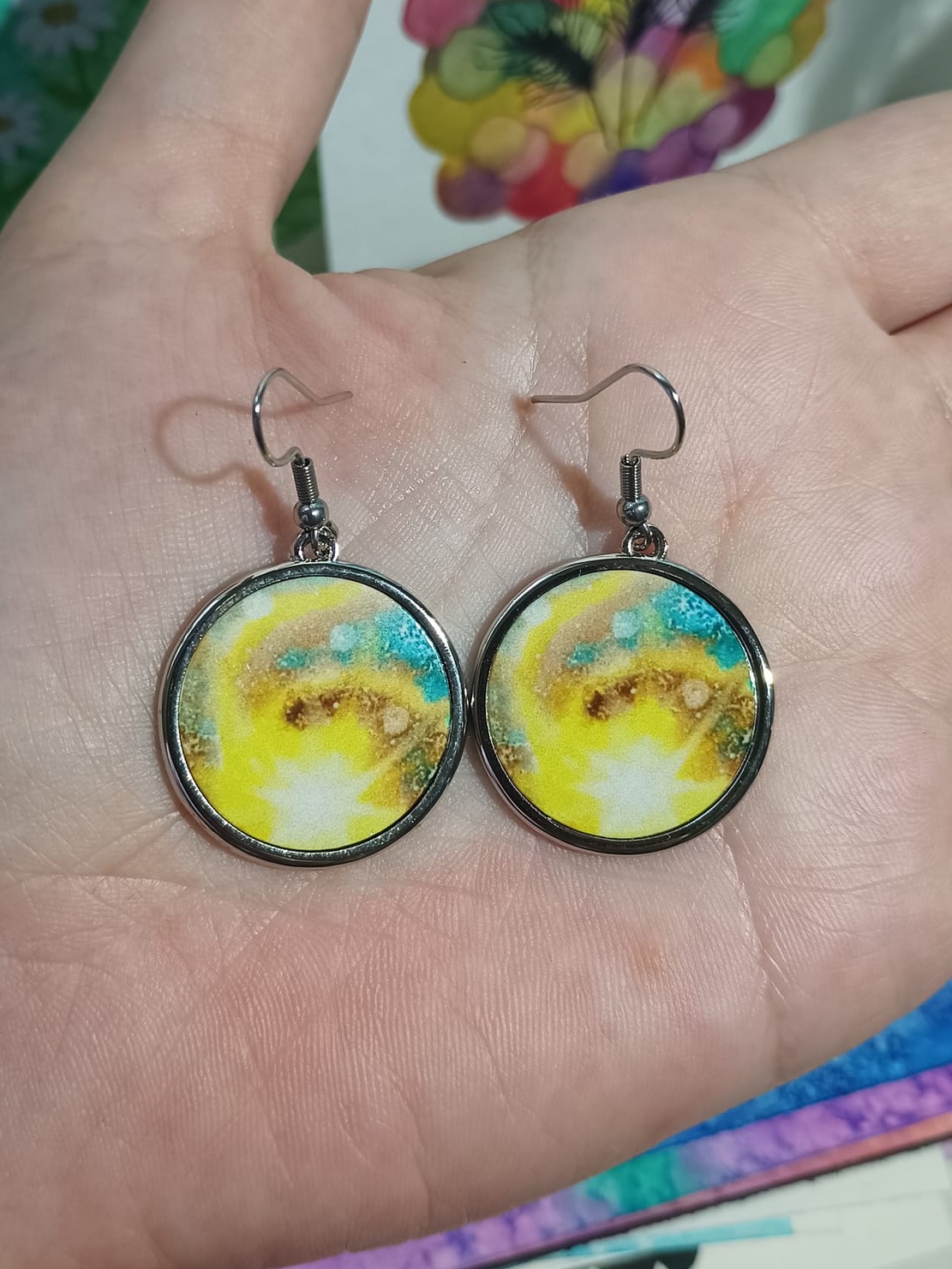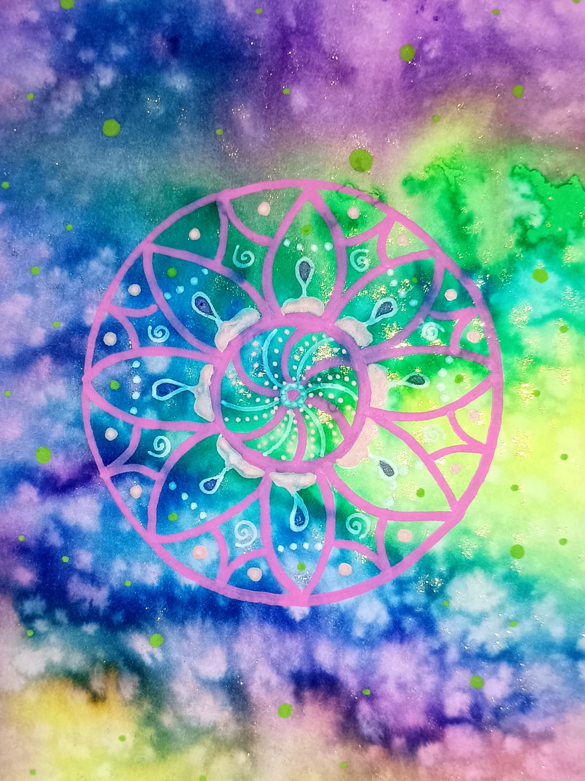 Obrázky tvořené pomocí alkoholových inkoustů, isopropylalkoholu a fénu, popřípadě brčka. Některé jsou dokreslené akrylovými fixy. Intuitivní tvorba, druh automatické kresby… Jsou ve formátu A5 na syntetickém papíru. Tyto malby dále fotím a používám k tisku na šperky, hrníčky, trička, polštáře, nebo z nich nechávám natisknout velkoformátové obrazy na plátno. Pokud o některý obrázek (nebo produkt z něj) máte zájem, stačí se ozvat na e-mail nebo napsat na facebook…