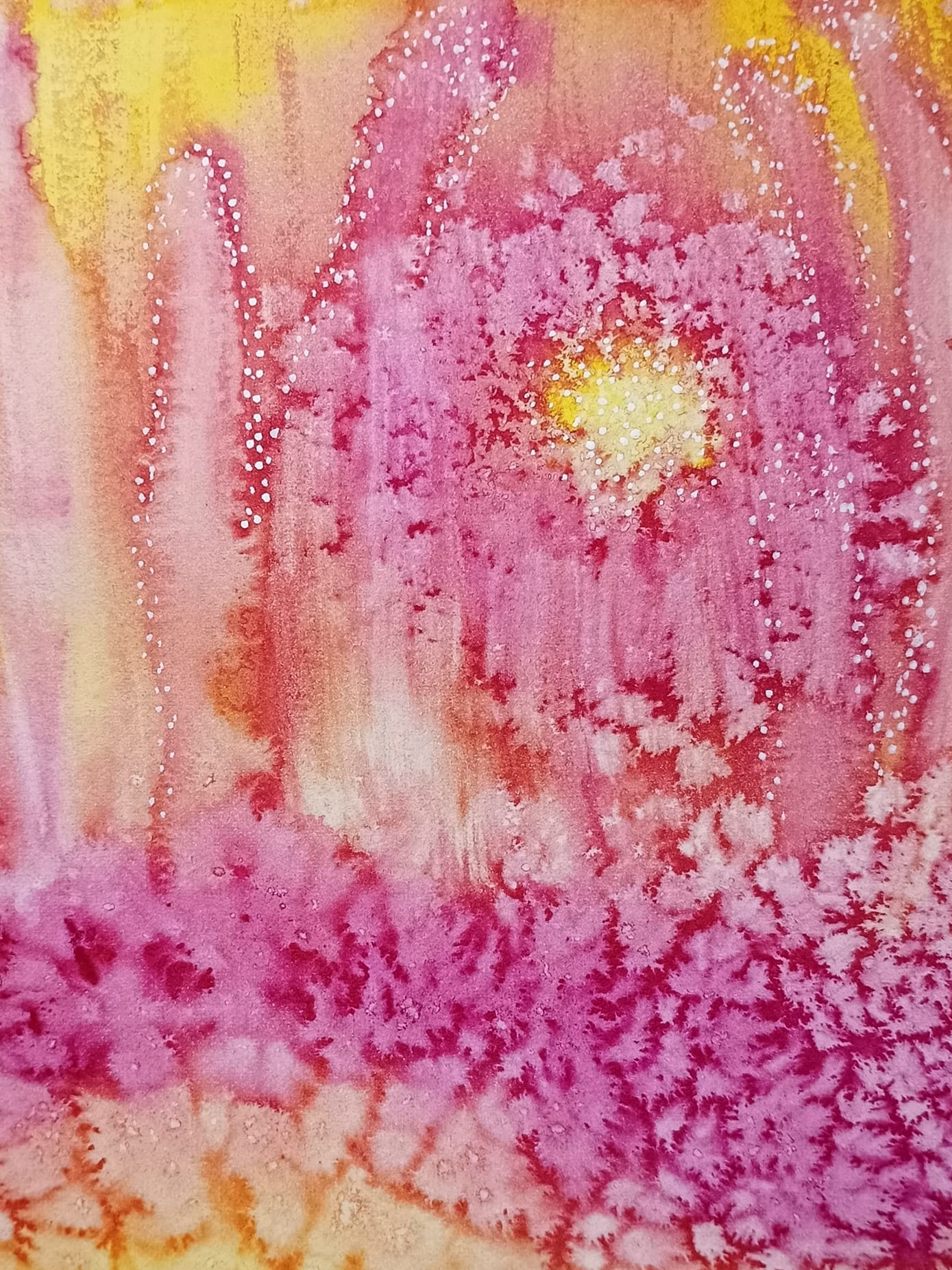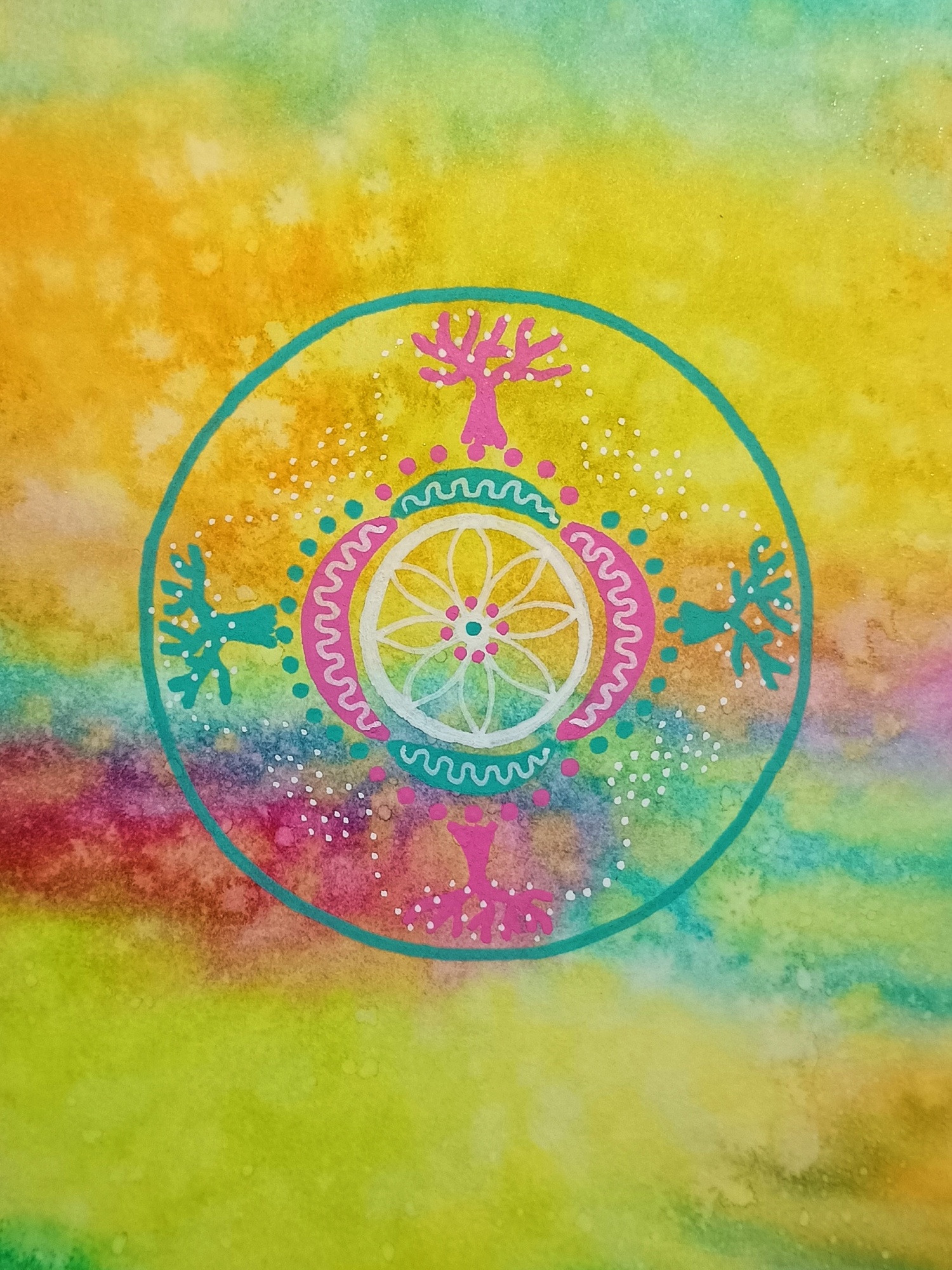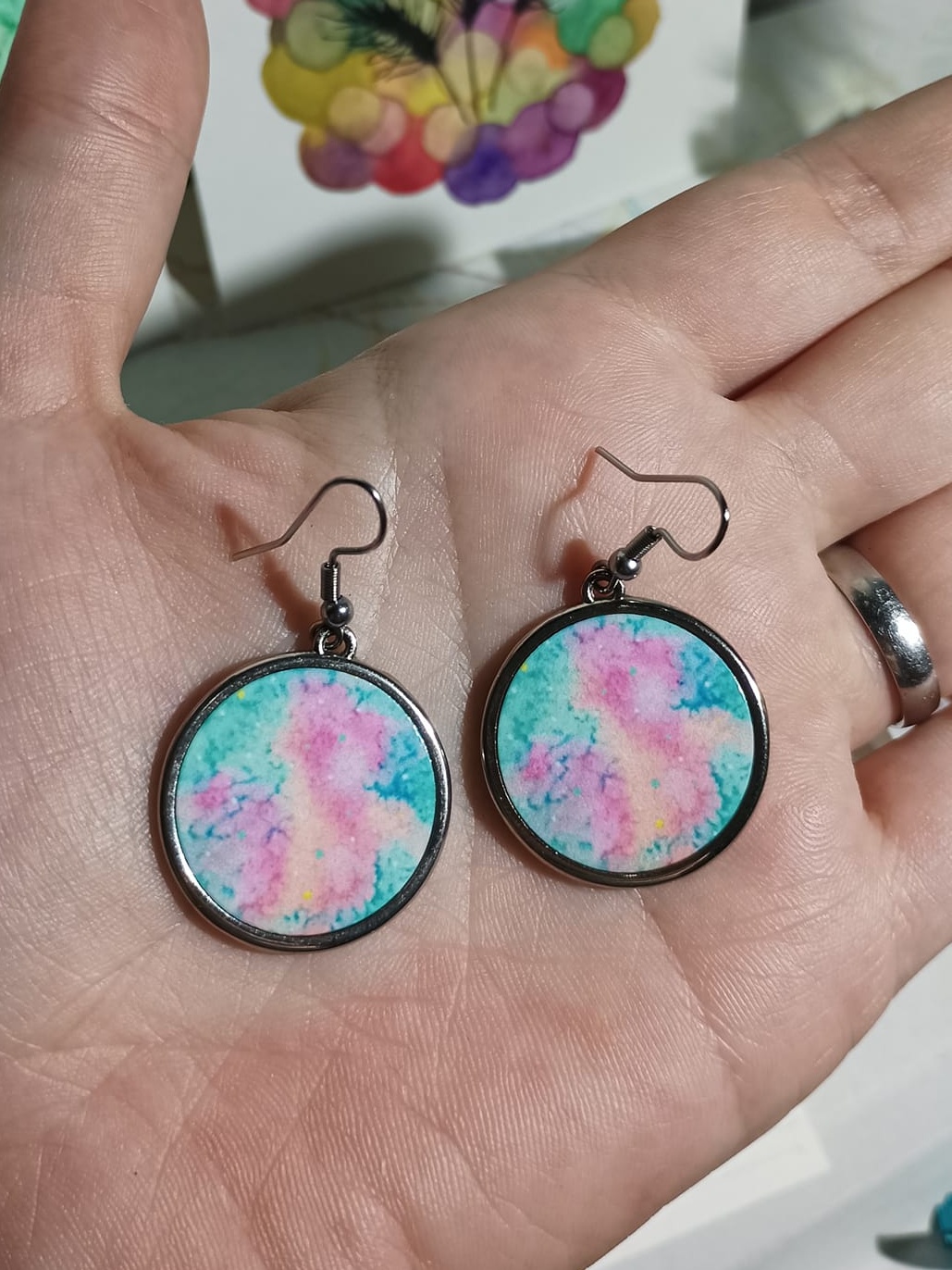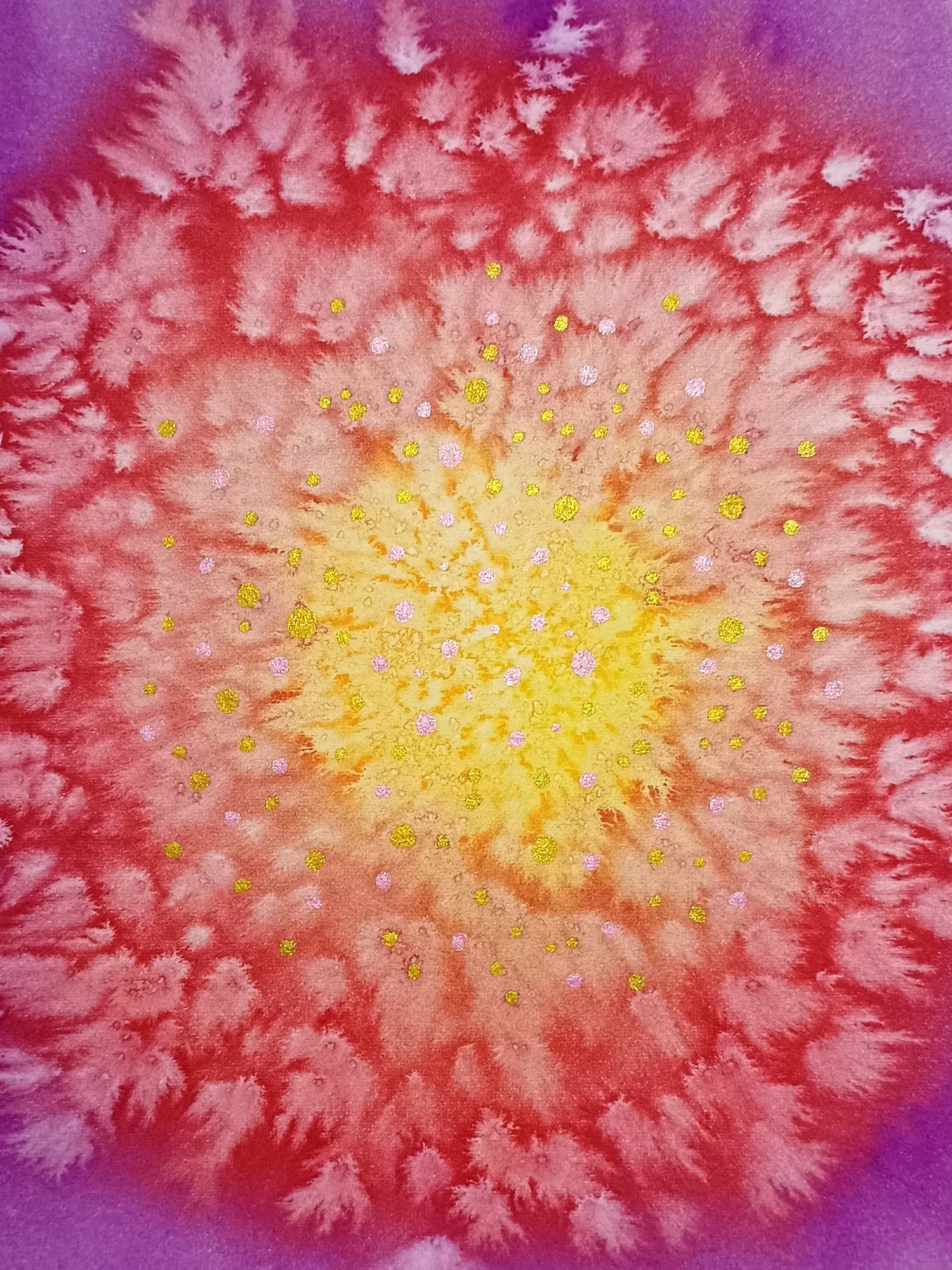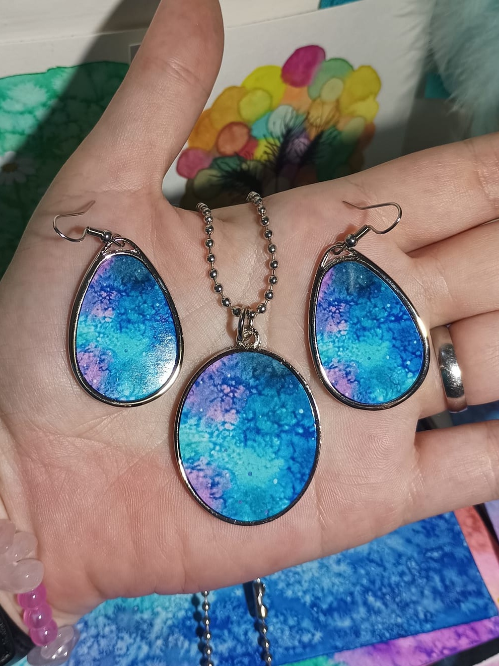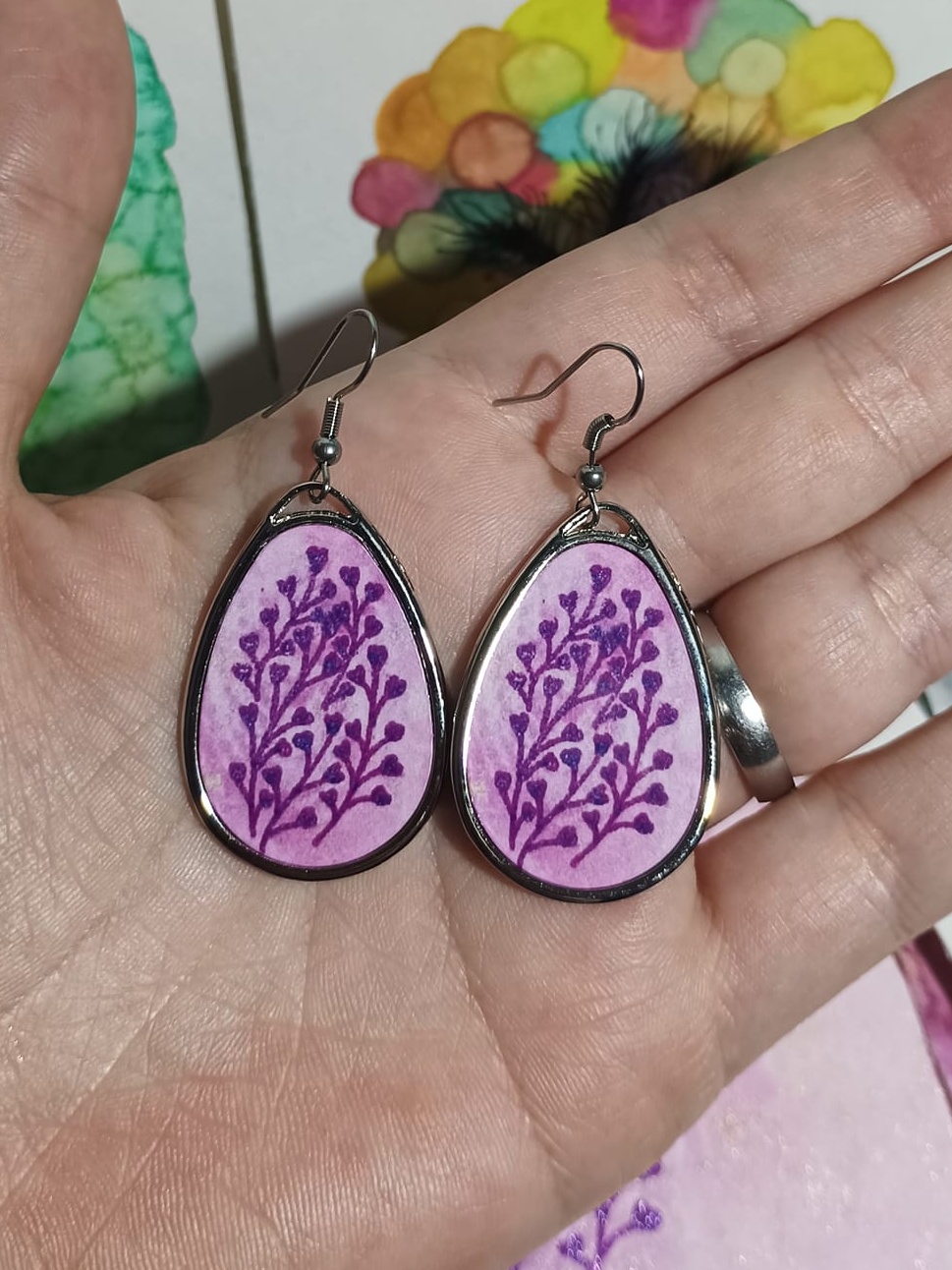 Obrázky tvořené pomocí alkoholových inkoustů, isopropylalkoholu a fénu, popřípadě brčka. Některé jsou dokreslené akrylovými fixy. Intuitivní tvorba, druh automatické kresby… Jsou ve formátu A5 na syntetickém papíru. Tyto malby dále fotím a používám k tisku na šperky, hrníčky, trička, polštáře, nebo z nich nechávám natisknout velkoformátové obrazy na plátno. Pokud o některý obrázek (nebo produkt z něj) máte zájem, stačí se ozvat na e-mail nebo napsat na facebook…