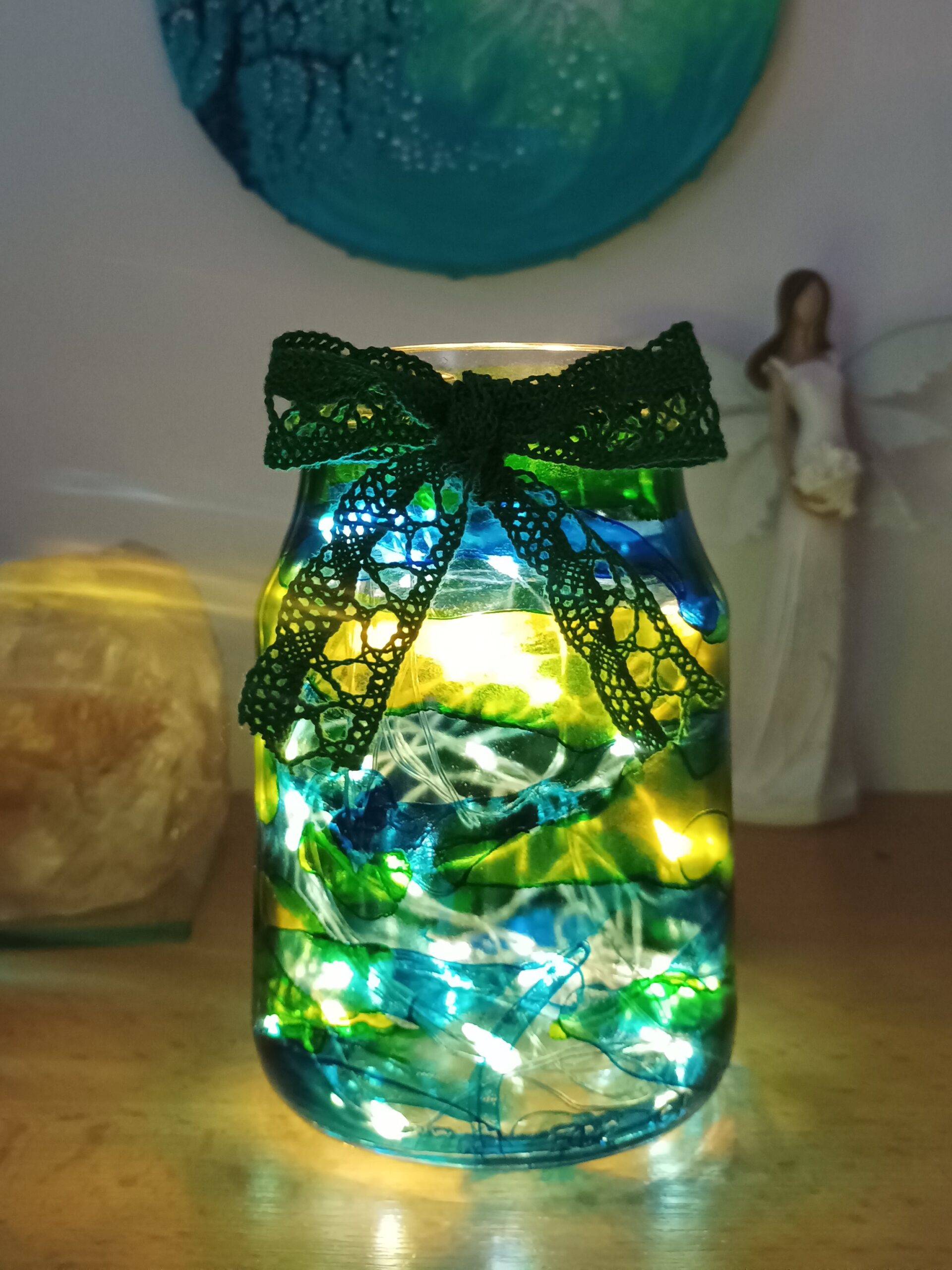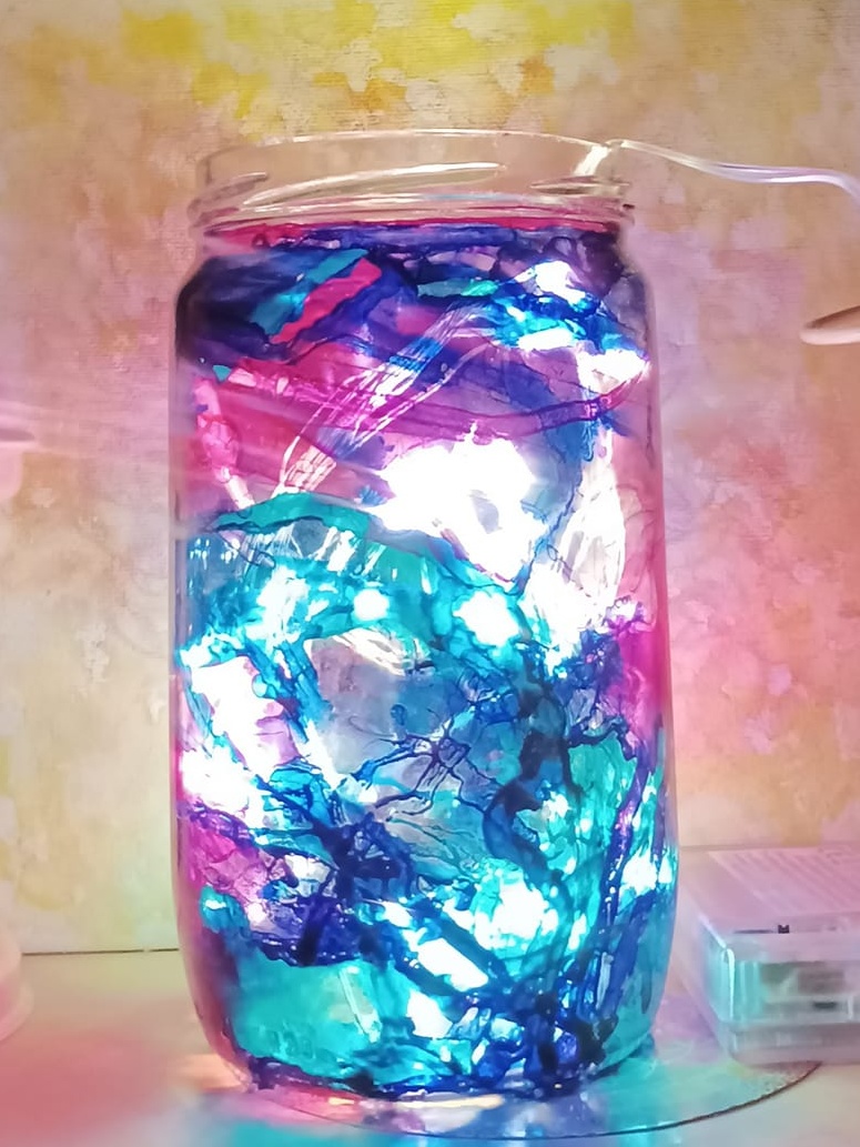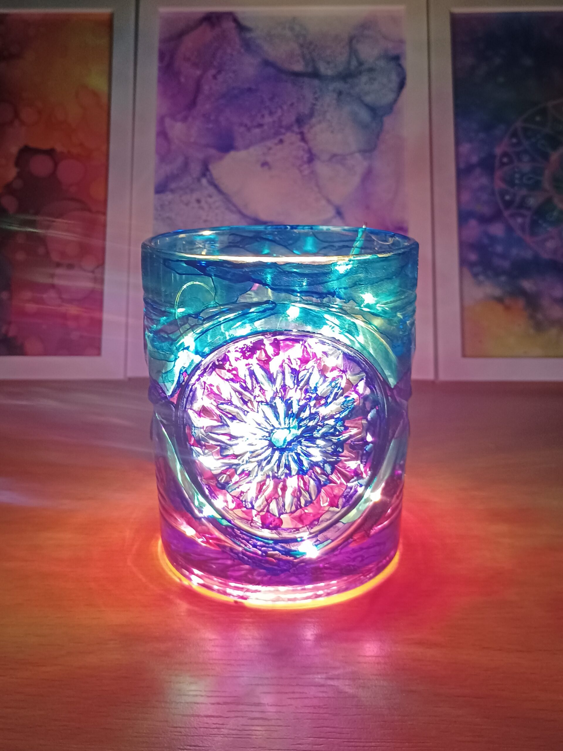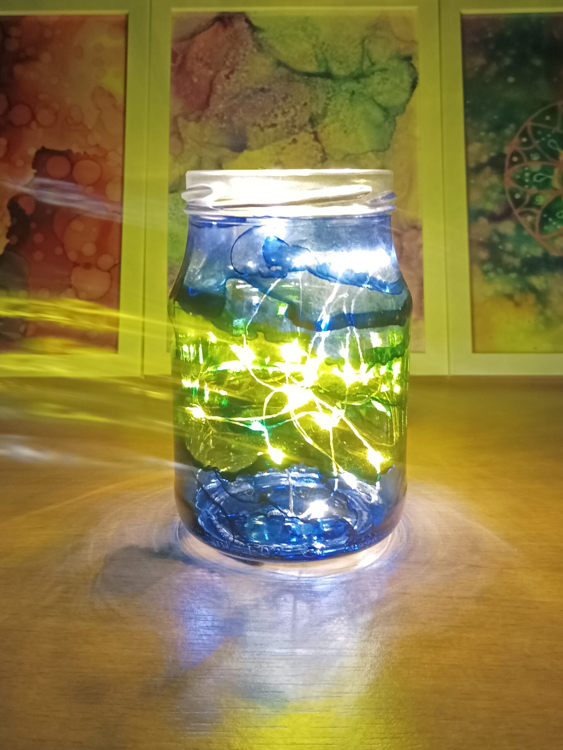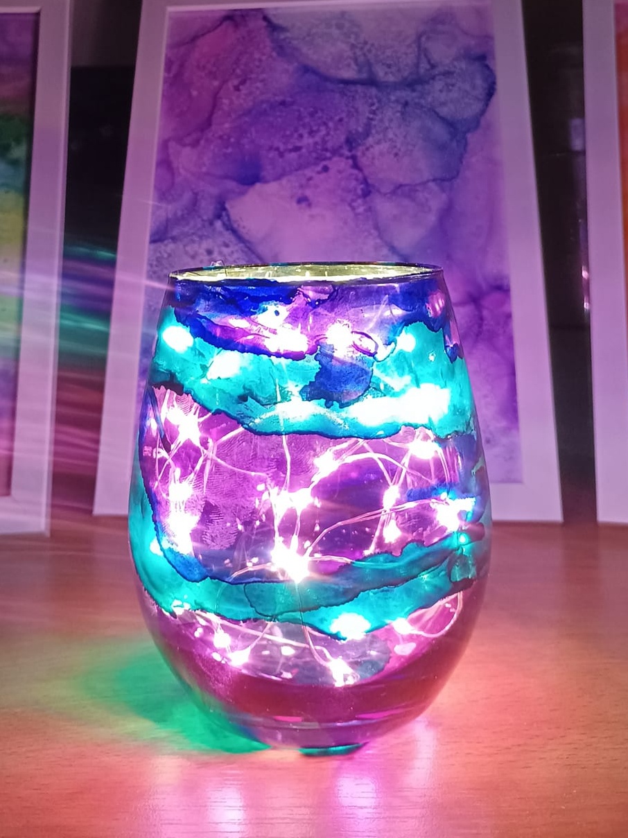 Lampičky, které ručně zdobím alkoholovými inkousty. Malované klasické skleničky, zavařovačky, broušené skleničky a uvnitř nich světlýlka na baterky…