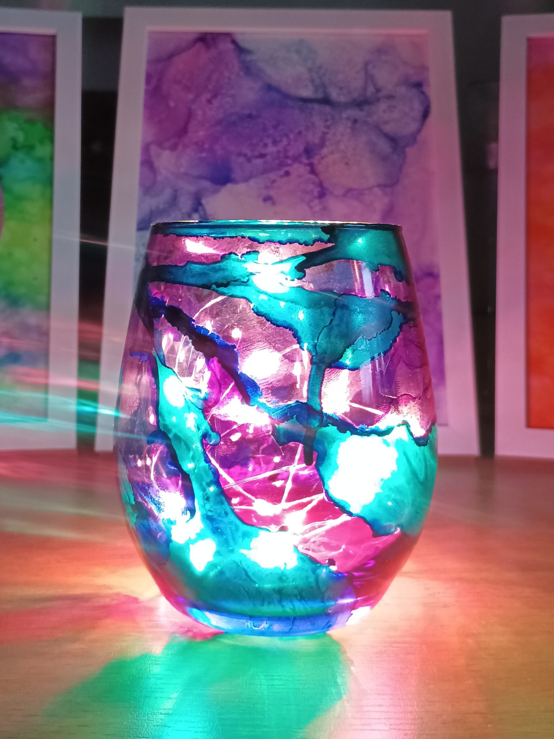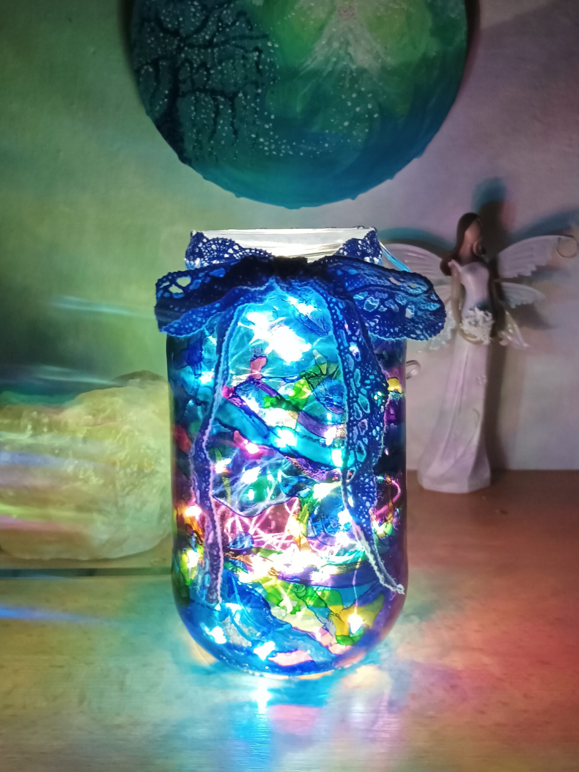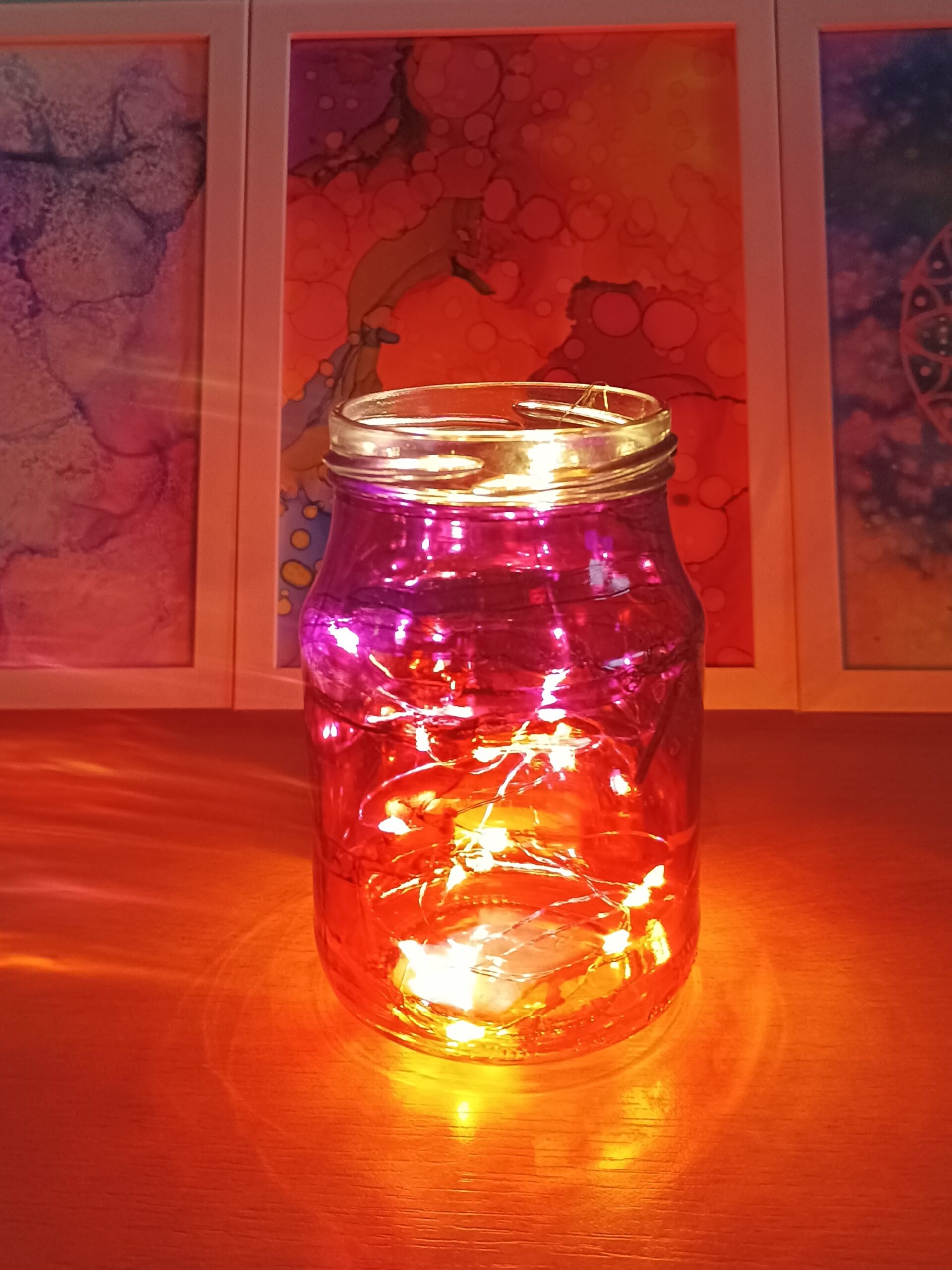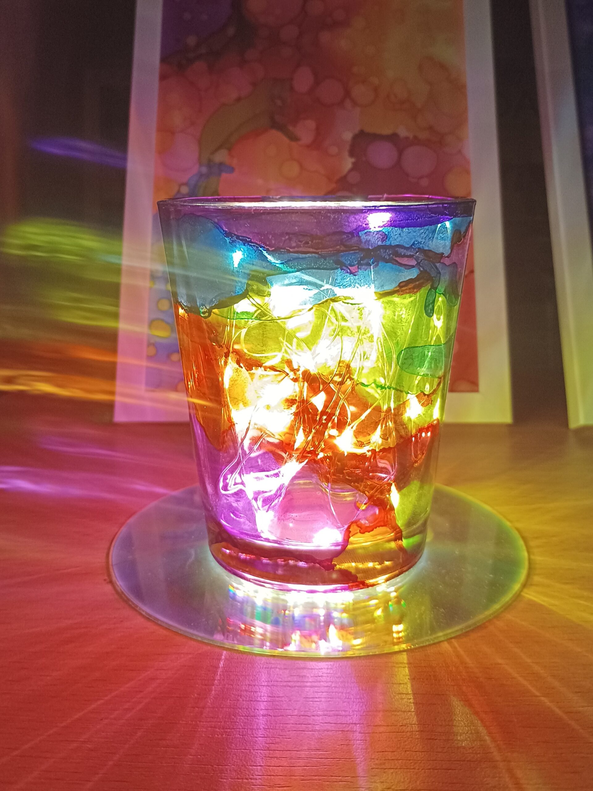 Lampičky, které ručně zdobím alkoholovými inkousty. Malované klasické skleničky, zavařovačky, broušené skleničky a uvnitř nich světlýlka na baterky…