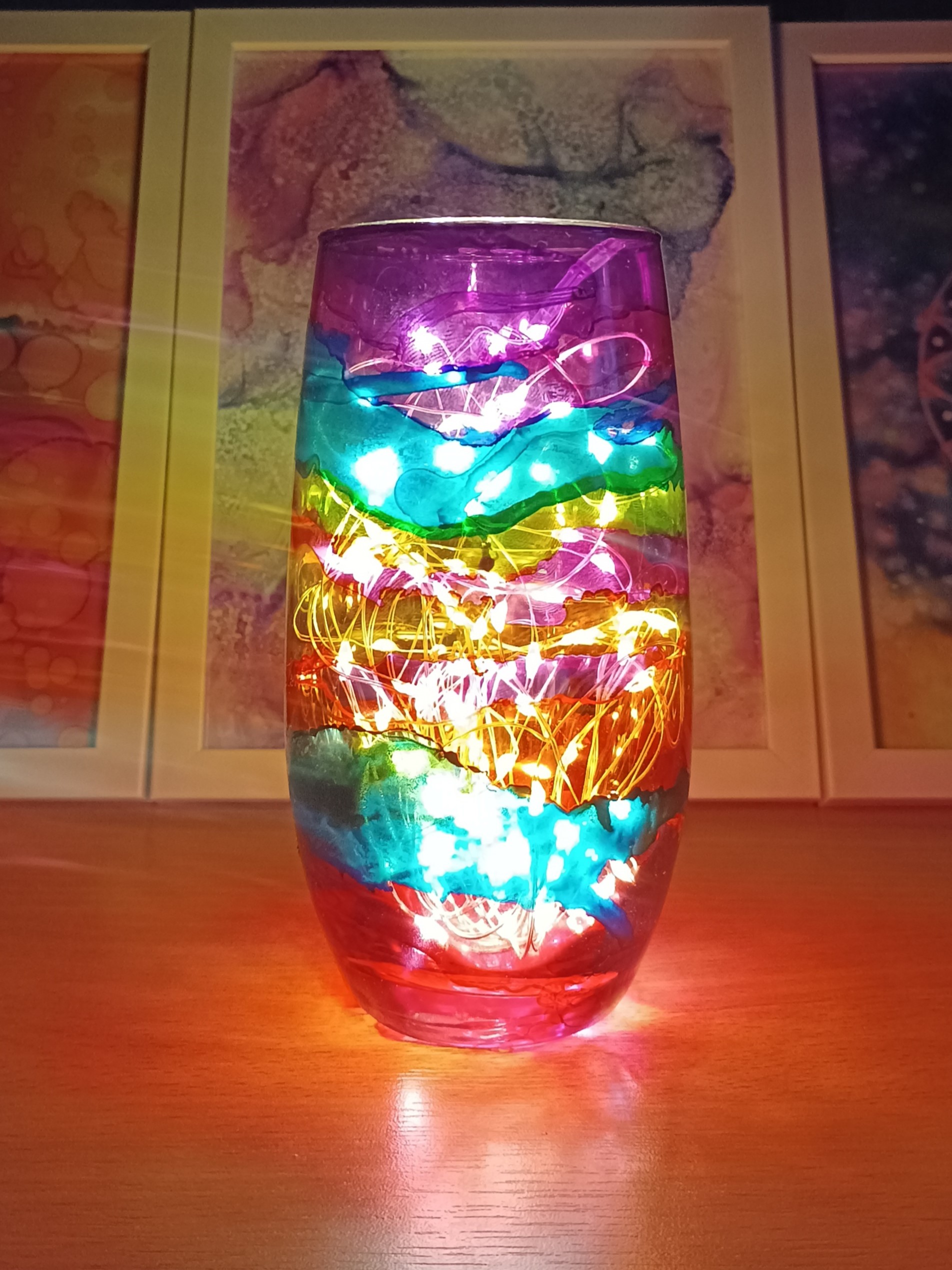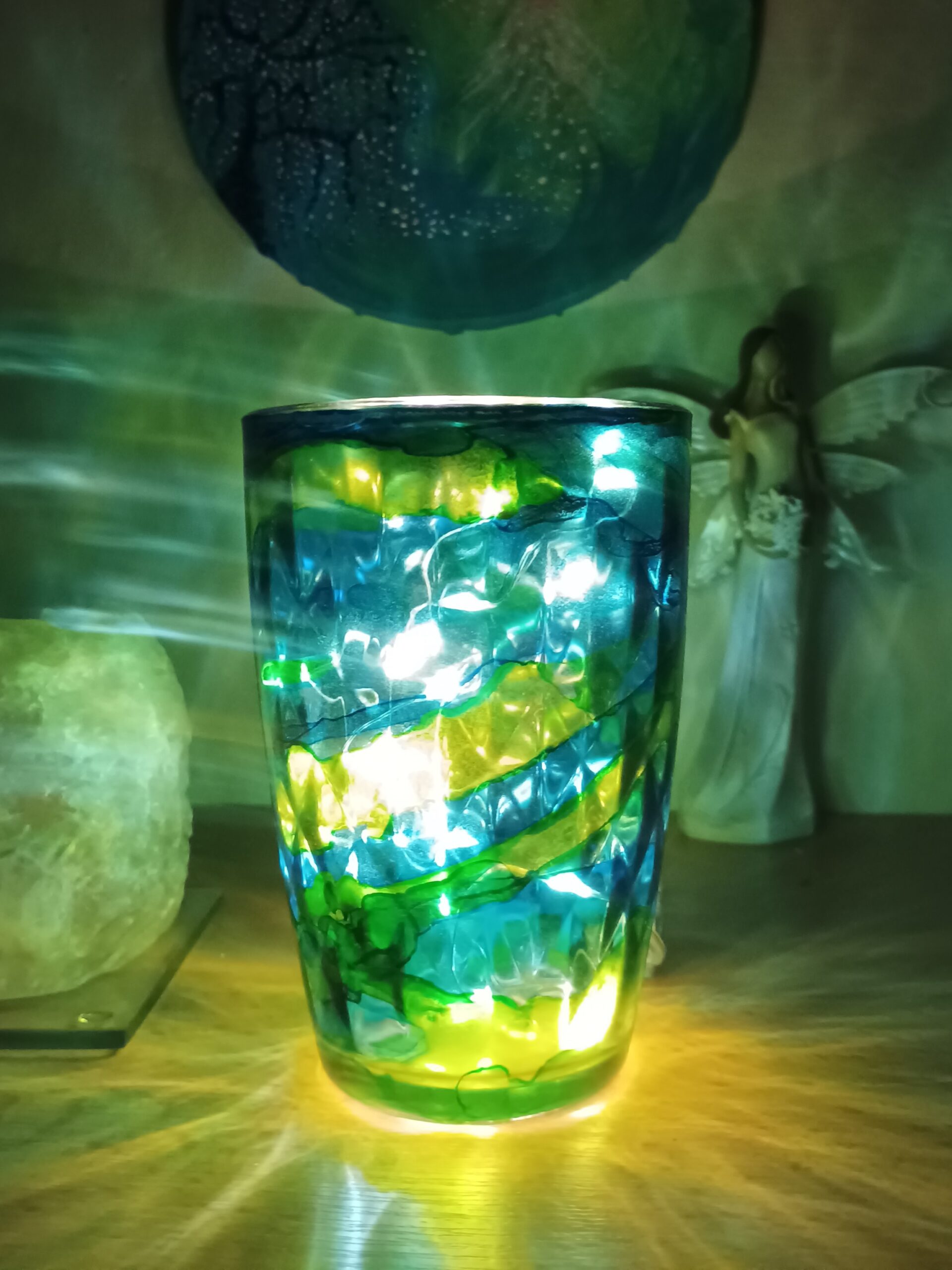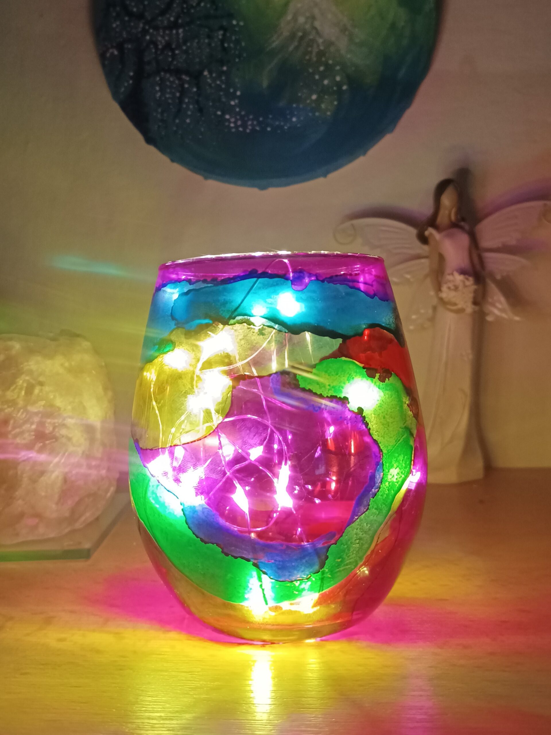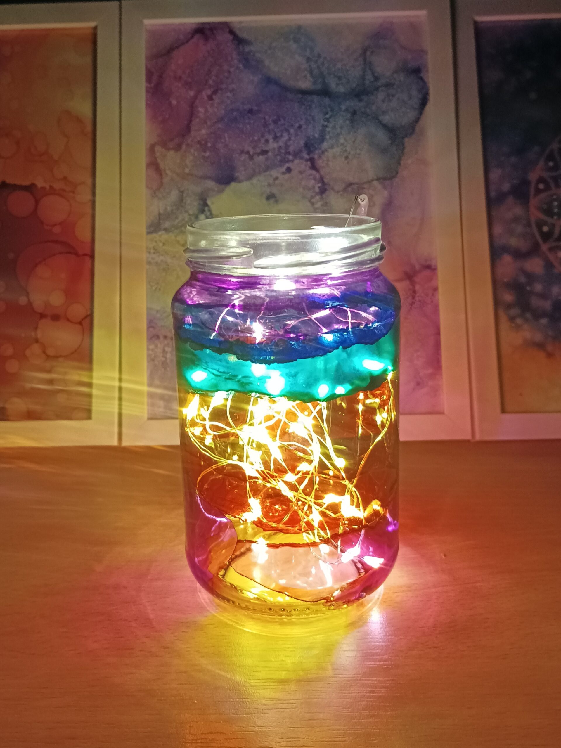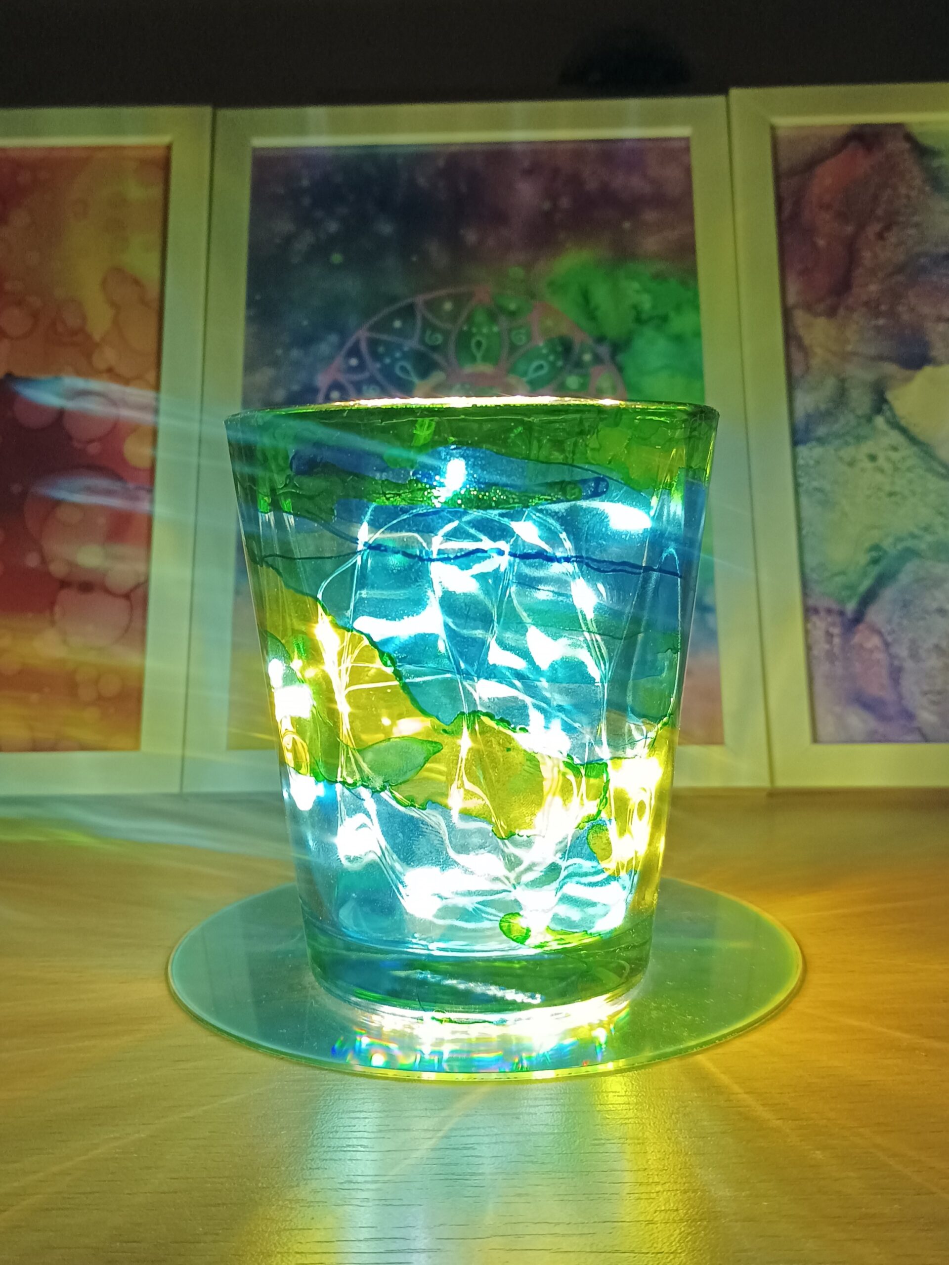 Lampičky, které ručně zdobím alkoholovými inkousty. Malované klasické skleničky, zavařovačky, broušené skleničky a uvnitř nich světlýlka na baterky…