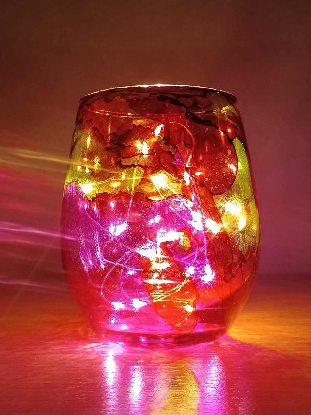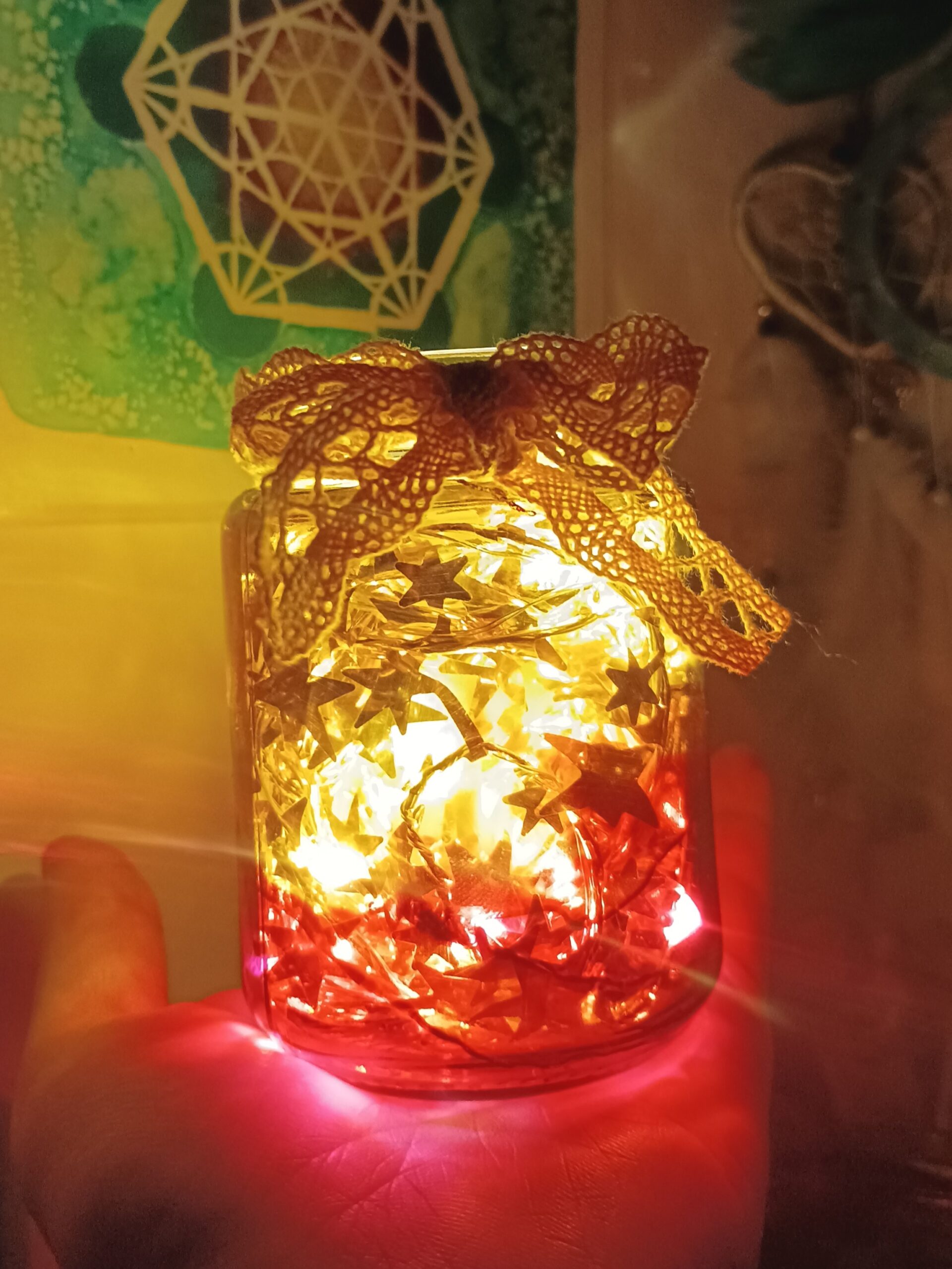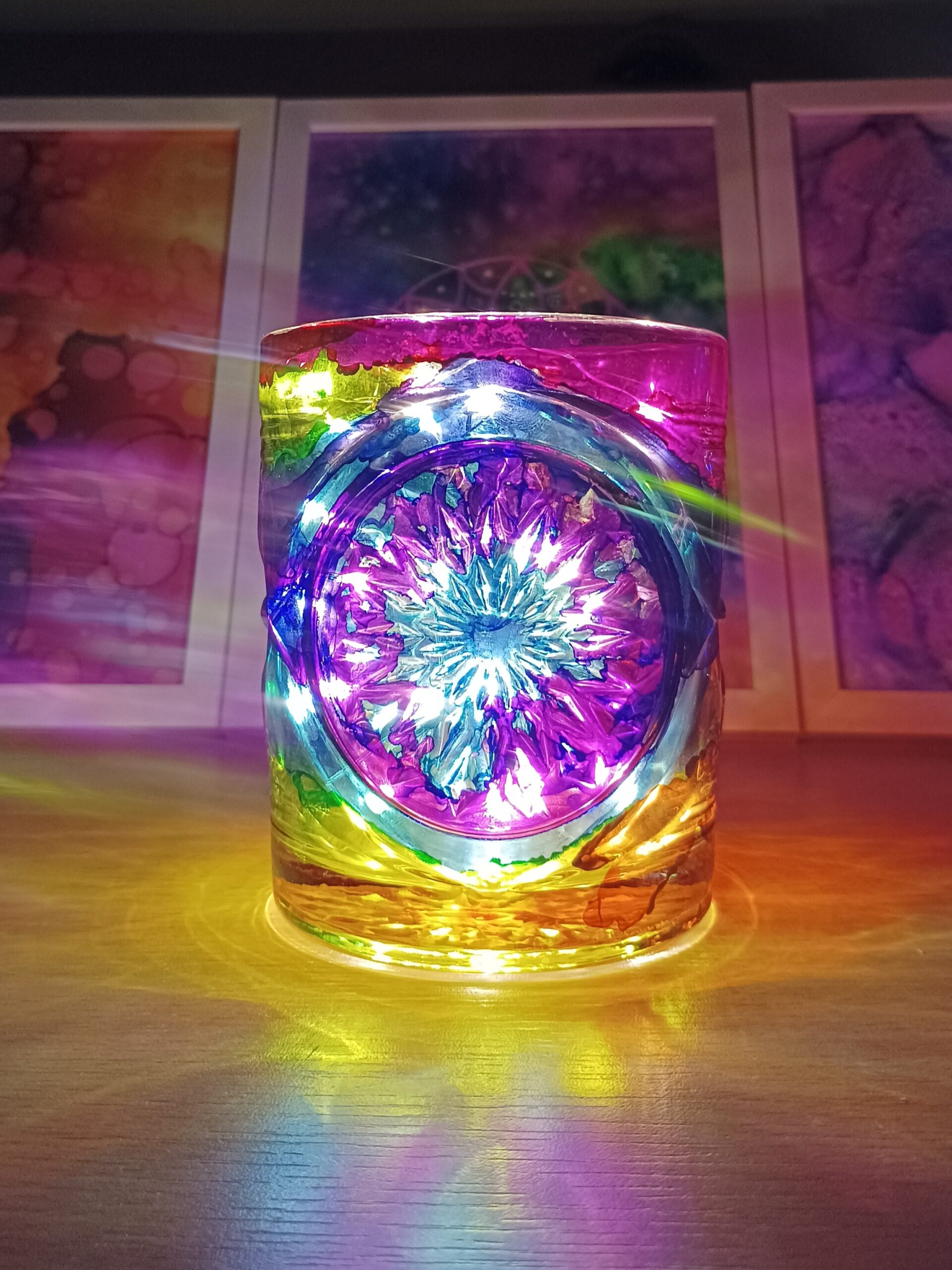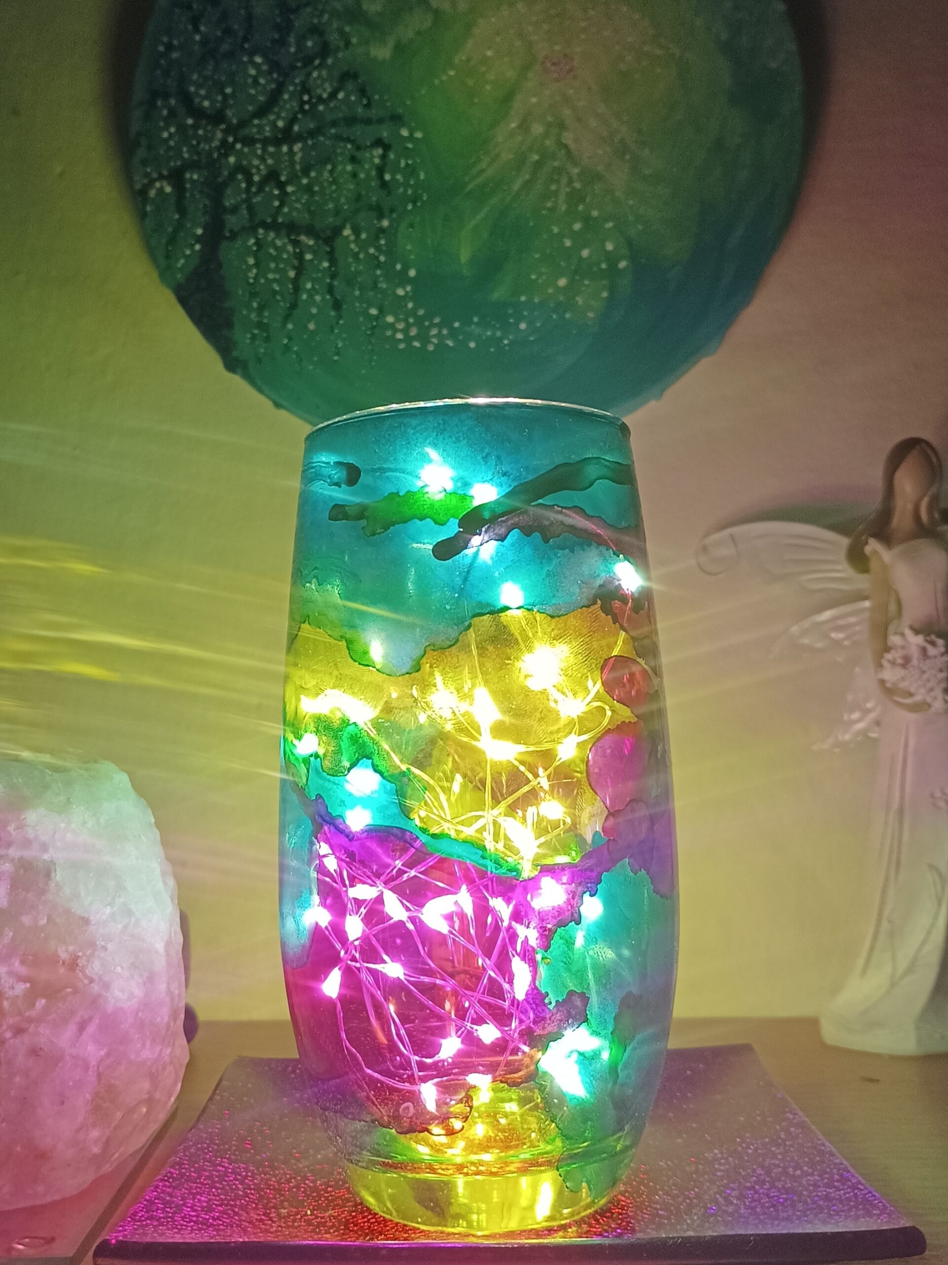 Lampičky, které ručně zdobím alkoholovými inkousty. Malované klasické skleničky, zavařovačky, broušené skleničky a uvnitř nich světlýlka na baterky…