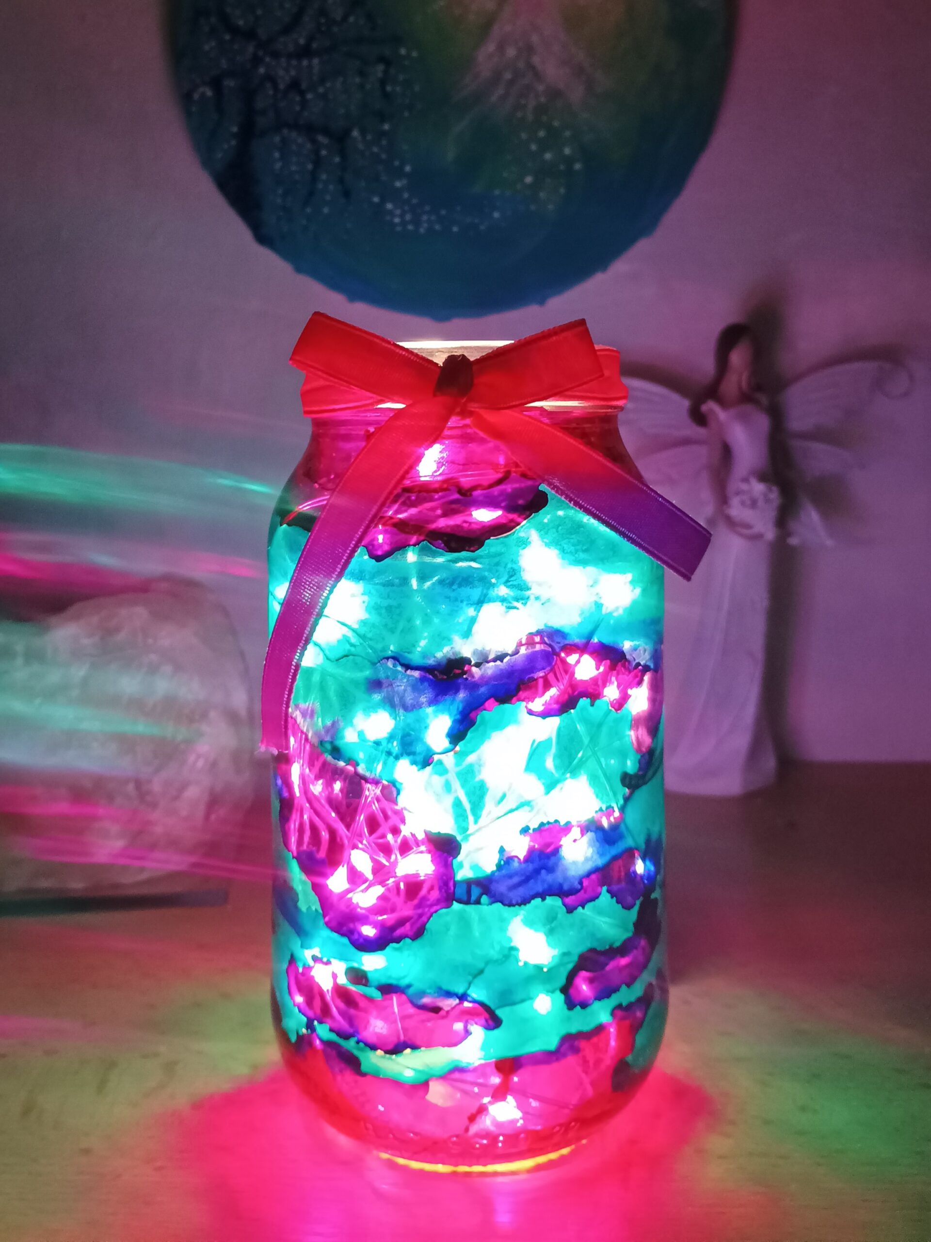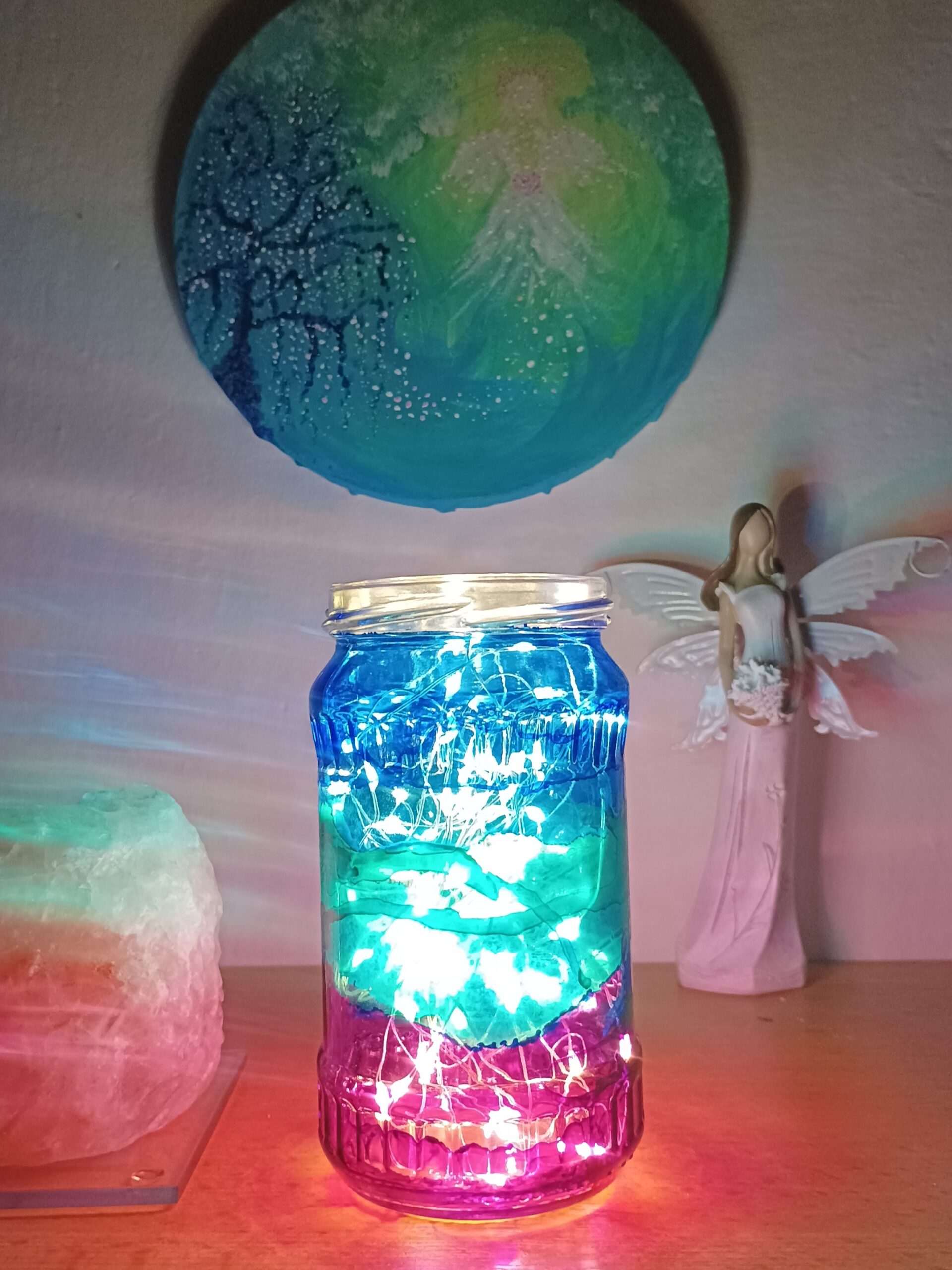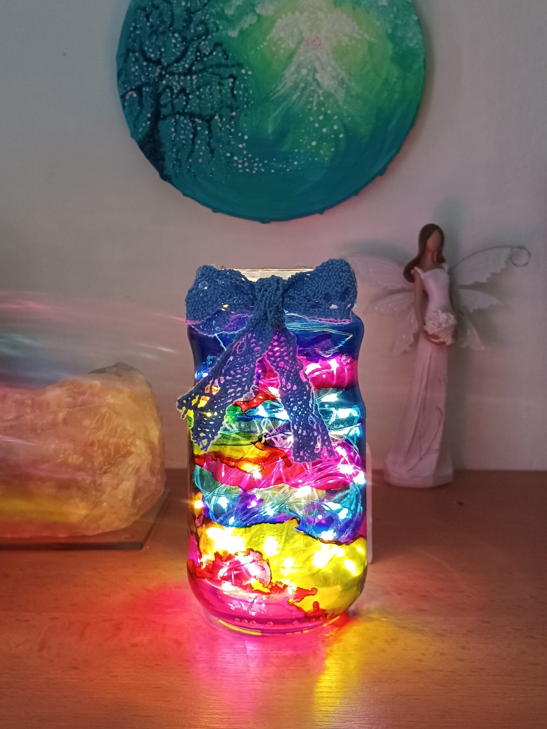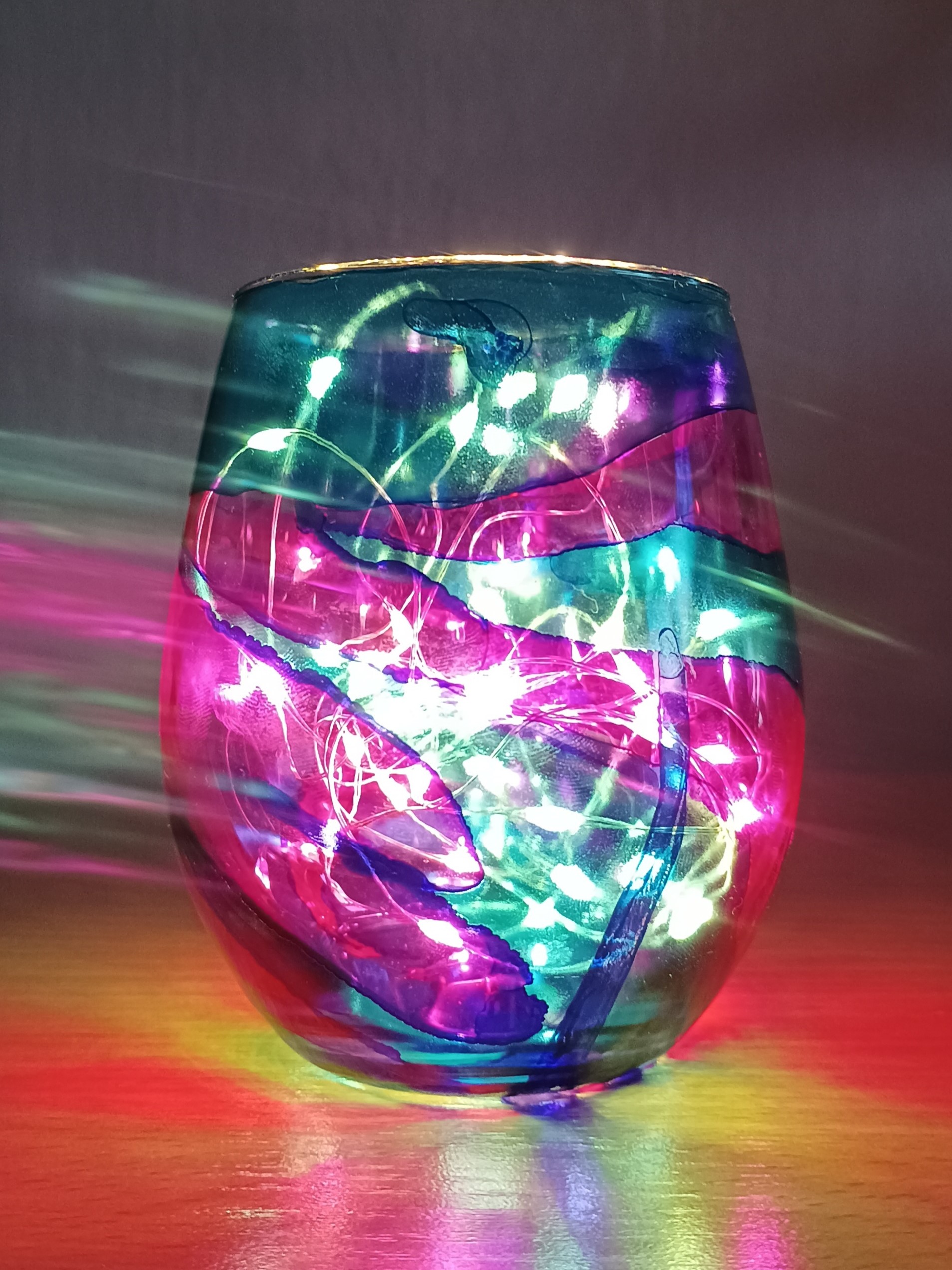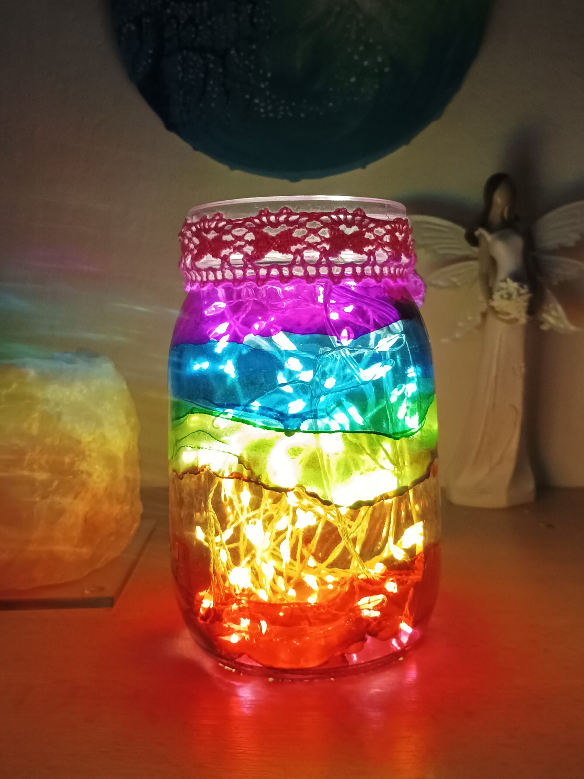 Lampičky, které ručně zdobím alkoholovými inkousty. Malované klasické skleničky, zavařovačky, broušené skleničky a uvnitř nich světlýlka na baterky…